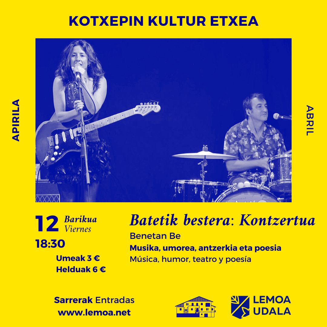 [eus] Gaur, apirilak 12, Benetan Be Teatroa Kotxepinen izango da eta ume eta familiei zuzendutako “Batetik bestera: kontzertua” lana eskainiko du. Saioa arrastiko 18:30ean izango da. Hauek dira artisten hitzak: 1. Zer aurkituko du Kotxepinera zuen kontzertua ikustera hurbiltzen denak? Haurrei eta familiei zuzendutako kontzertua aurkituko du. Haurrek ez ezik helduek ere gozatu dezaten musika … Irakurtzen jarraitu “Batetik bestera: kontzertua” haur eta familiei zuzendutako proposamen eszeniko-musikala – Propuesta escénico-musical para público infantil y familiar