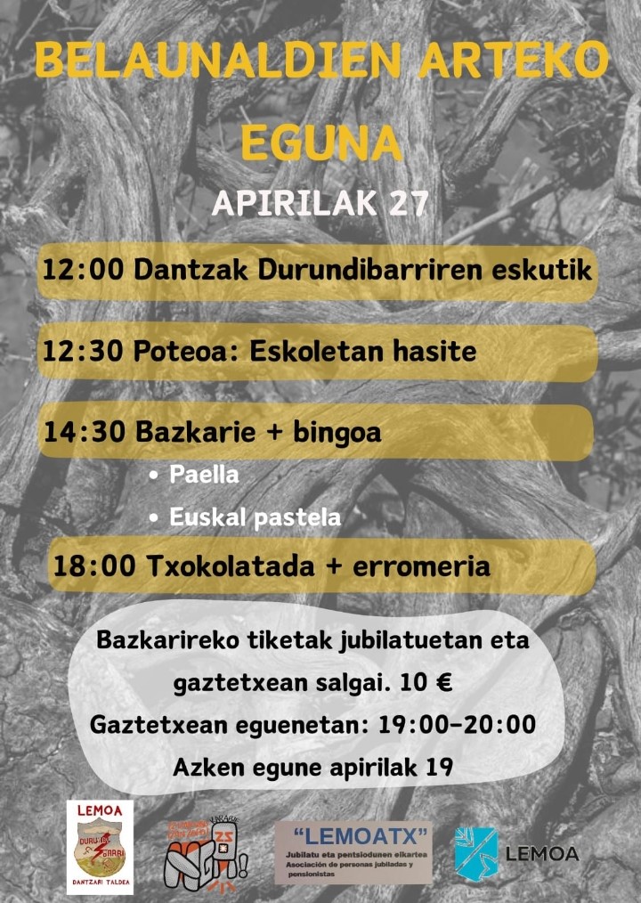 [eus] Lemoatx Jubilatu eta Pentsiodunen elkarteak, Harriketarrak Gazte Asanbladak eta Durundibarri Dantza Taldeak egun osoko egitaraua antolatu dute biharko: