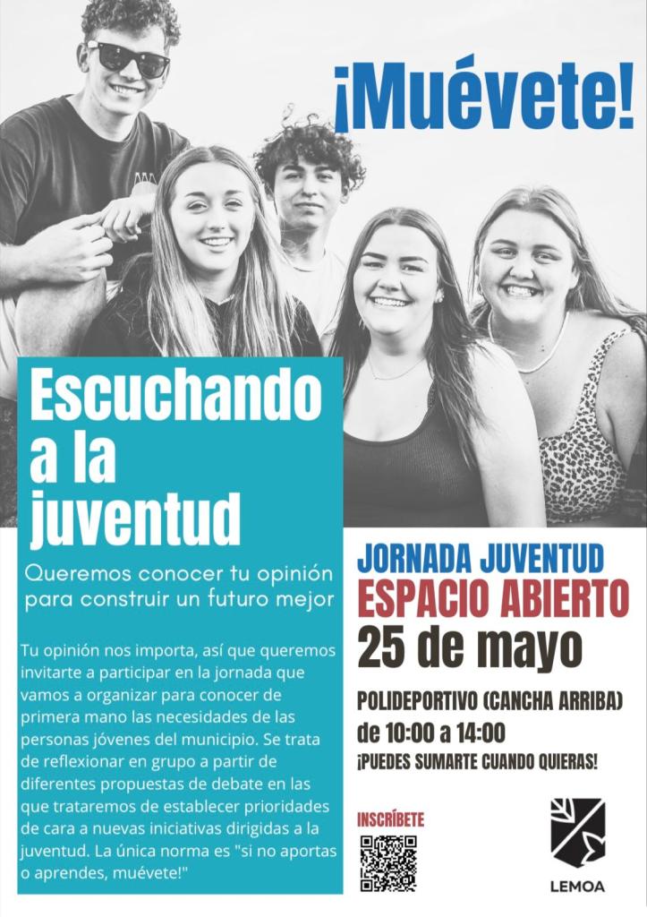 [cas] El Ayuntamiento de Lemoa ha organizado una jornada de juventud el 25 de mayo para las y los jóvenes del municipio. Será una jornada para conocer la primera mano las necesidades de las personas jóvenes de Lemoa. Las y los participantes reflexionarán en grupo a partir de diferentes propuestas de debate para tratar de establecer prioridades de cara a crear nuevas iniciativas dirigidas a la juventud. La única norma es “Si no aportas o aprendes, ¡muévete!”. La jornada será por la mañana, de 10:00 a 14:00, pero puedes acercarte cuando queiras. La inscripción puede realizarse a través del código QR que aparece en el cartel.