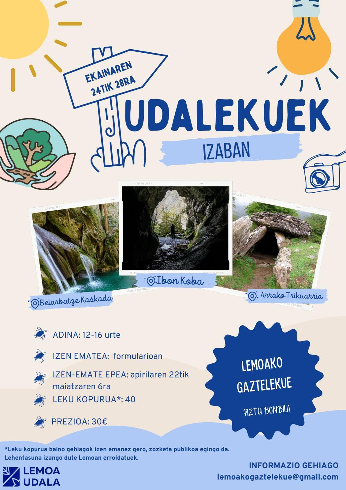 [eus] Lemoako Gaztelekuak udalekuak antolatu ditu Izaban ekainaren 24tik 28ra, 12 eta 16 urte bitarteko gazteentzat. Parte-hartzaileek Belabartze ur-jauzia, Ibon koba eta Arrako trikuharria bisitatuko dituzte, besteak beste.