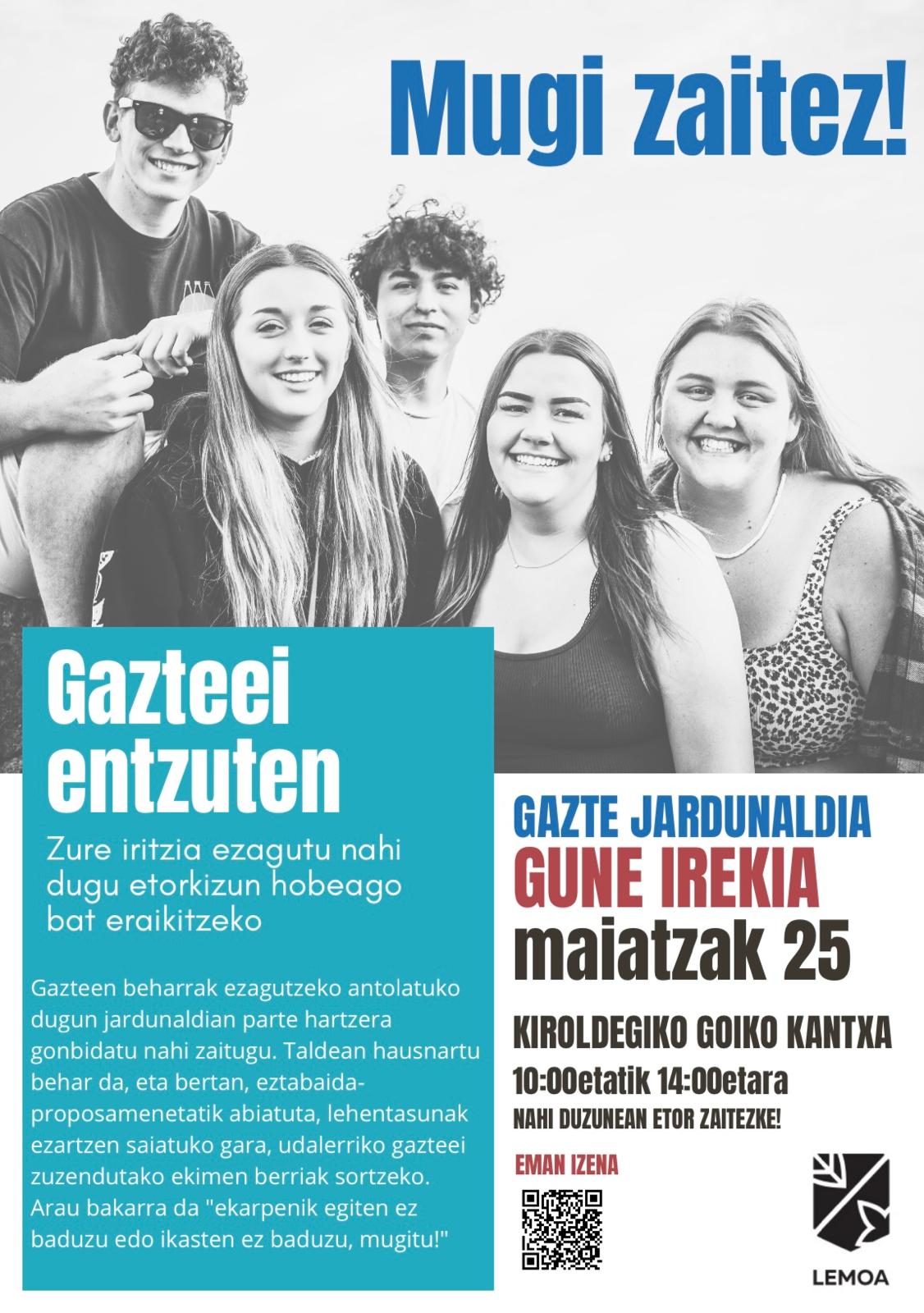 [eus] Lemoako Udalak udalerriko gazteen (16-29 urte) beharrei eta interesei buruzko diagnostikoa egingo du. Hori dela eta, Gune Irekia Jardunaldia antolatu du maiatzaren 25ean eta gazteentzako online galdetegia abiatu du. 1. Gure Irekia Jardunaldia Gune ireki bat da, non parte-hartzaileek gai espezifikoak proposatzen dituzten eta gai horiek eztabaidatzeko bilerak programatzen dituzte. Ez dago aurrez ezarritako … Irakurtzen jarraitu Gazteei entzuten – Escuchando a la juventud