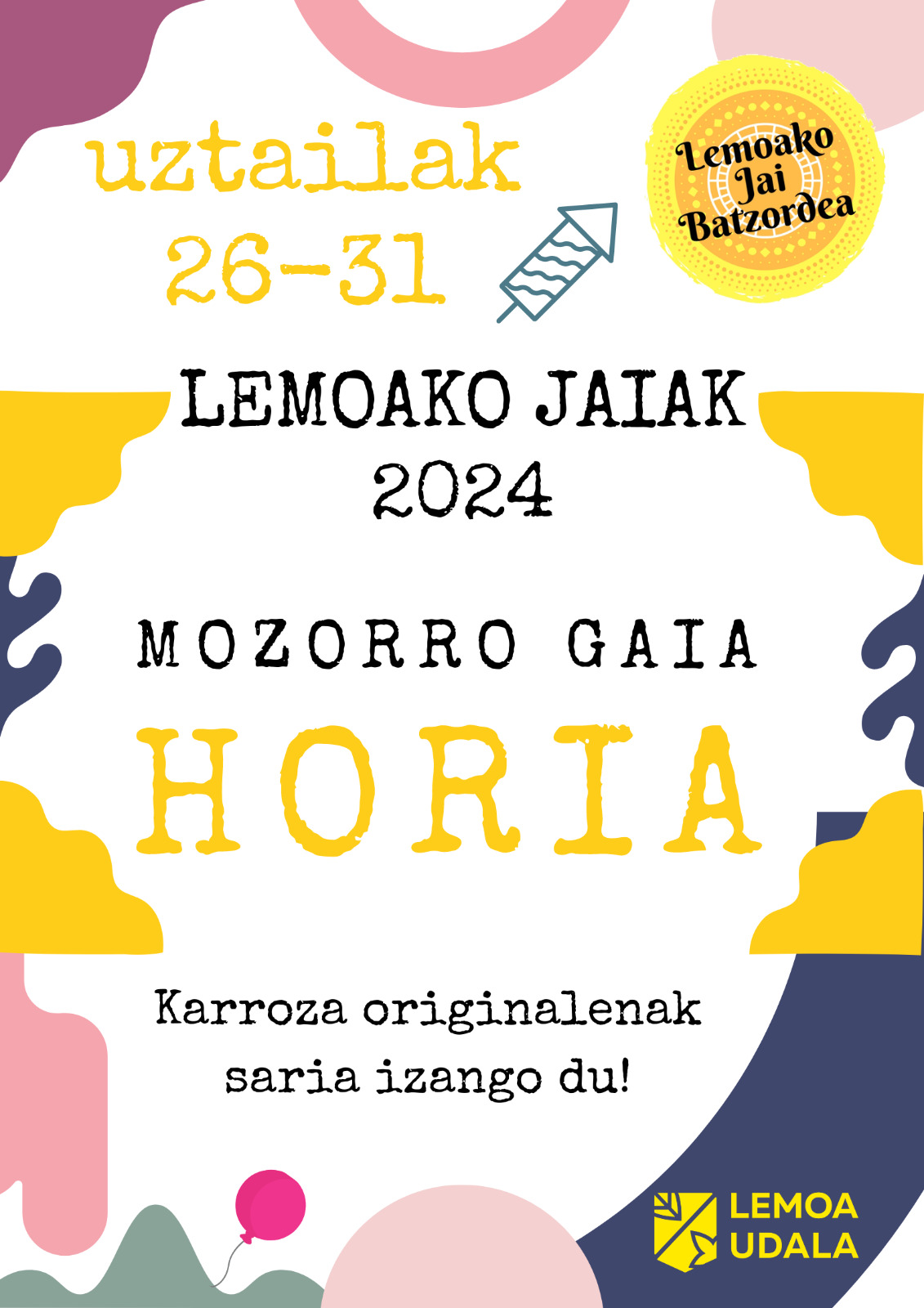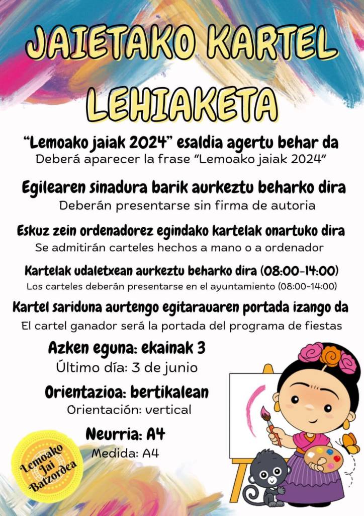 [eus] AurtengoLemoako jaiak uztailaren 26tik 31ra izango dira eta Jai Batzordea buru belarri ari da lanean ordurako dena prest egon dadin. Dagoeneko, etxerako lanak jarri dizkiete Lemoako herritarrei: alde batetik, kartel lehiaketan parte hartu nahi dutenek ekainaren 3ra arte izango dute epea euren lanak aurkezteko, eta, bestetik, mozorroen gaia aukera dute, kolore beilegia, hain zuzen ere.