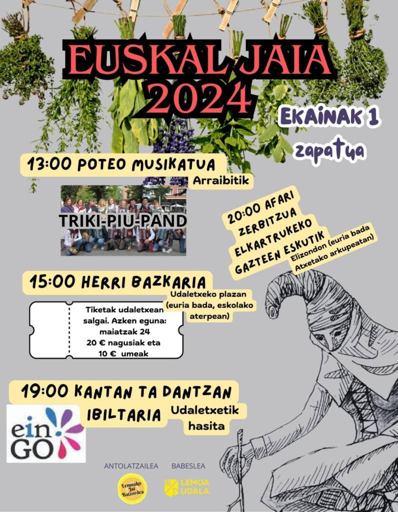 Por si todo ello fuera poco, en junio hay otra importante fiesta llamando a la puerta: Euskal Jaia, que se celebrará el 1 de junio. Los tickets para la comida estarán a la venta en el ayuntamiento hasta el 24 de mayo.