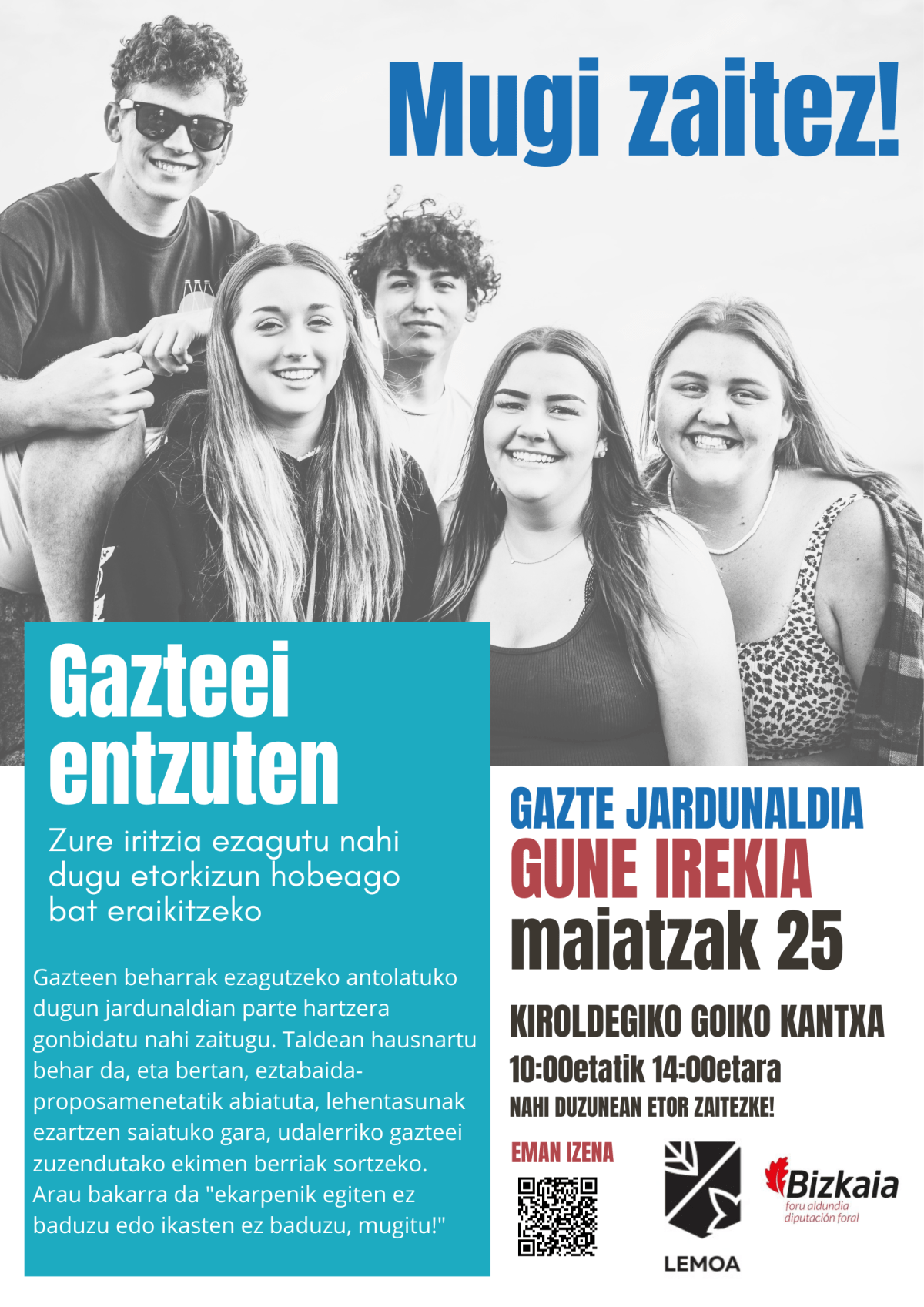 La jornada tendrá lugar mañana, 25 de mayo de 10:00 a 14:00, pero puedes acercarte cuando quieras. La inscripción puede realizarse a través del código QR que aparece en el cartel o en el siguiente enlace: https://labur.eus/AhGzY