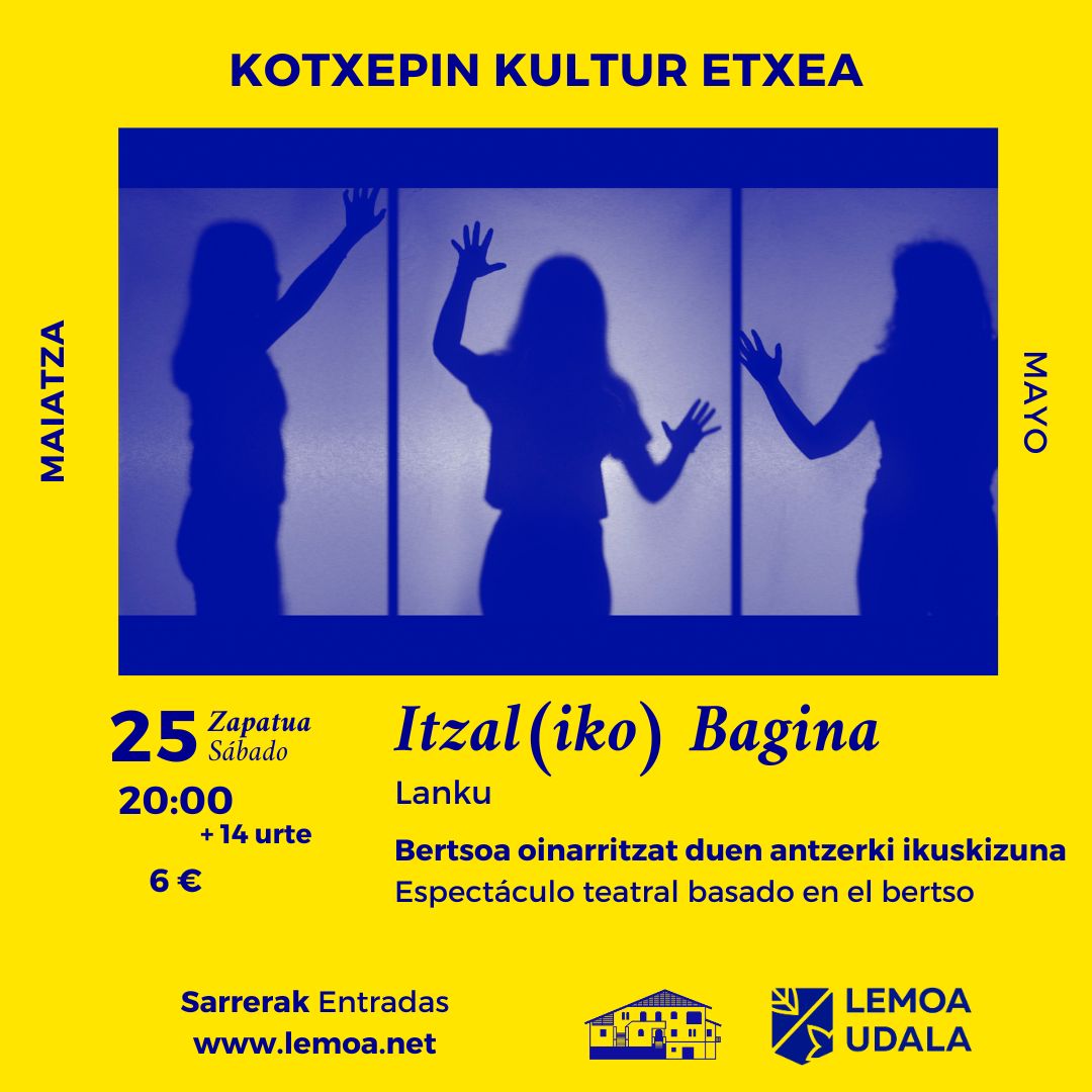 [eus] Zapatuan, maiatzaren 25ean, “Itzal(iko) bagina” ikuskizuna eskainiko du Lankuk Kotxepin kultur etxean. Bertsoa oinarritzat duen antzerki ikuskizuna da, 20:00etan izango da eta 14 urtetik gorakoei dago zuzenduta. Sarrerak: https://kultura.lemoa.net/sarrerak [cas] El sábado, 25 de mayo, Lanku ofrecerá el espectáculo “Itzal(iko) bagina” en la casa de cultura Kotxepin. Se trata de un espectáculo teatral basado … Irakurtzen jarraitu Itzal(iko) bagina: bertsoa oinarritzat duen antzerki ikuskizuna – Un espectáculo teatral basado en el bertso