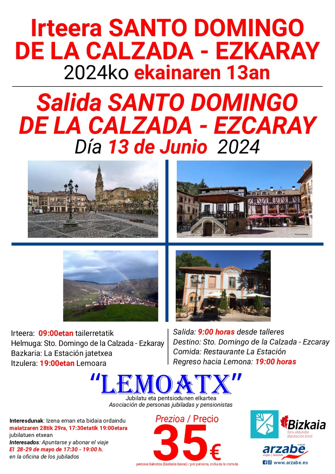 [eus] Lemoatx Jubilatu eta Pentsiodunen Elkarteak Santo Domingo de la Calzada eta Ezcaray bisitatzeko bidaia antolatu du ekainaren13rako. Izen-ematea maiatzaren 28an eta 29an egin ahal izango da jubilatuen etxean, 17:30etik 19:00etara.