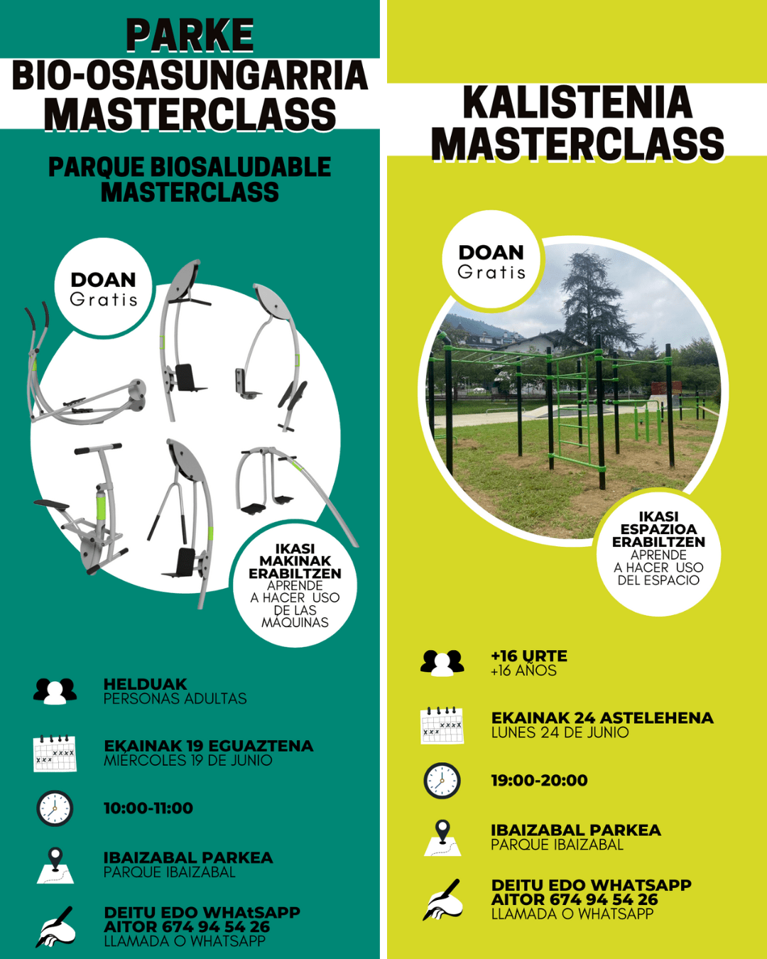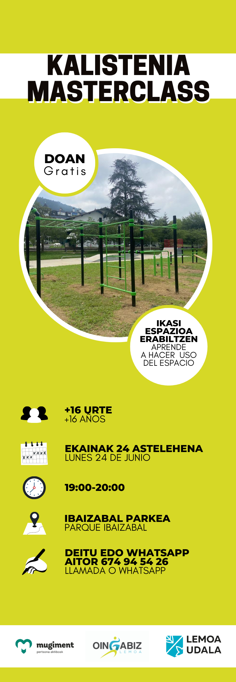 - Kalistenia: ekainaren 24an izango da, 19:00etatik 20:00etara. 16 urtetik gorakoei zuzendutako klasea izango da, espazioa erabiltzen ikasteko. Ibaizabal parkean.