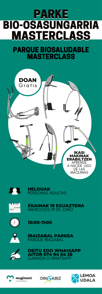 - Parke bio-osasungarria: ekainaren 19an izango da, 10:00etatik 11:00etara. Helduei zuzendutako klasea izango da, parkeko makinak erabiltzen ikasteko. Ibaizabal parkean.