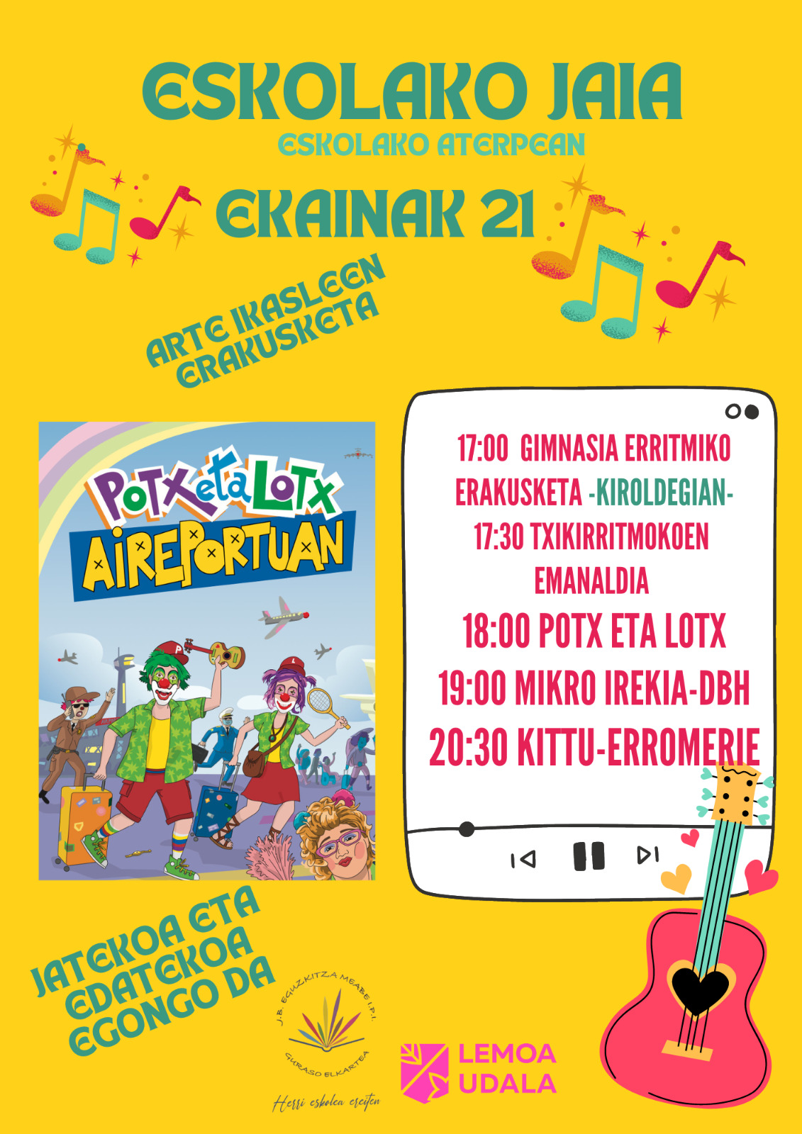 [eus] Gurasoen elkarteak eta udalak Eskola Jaia antolatu dute ekainaren 21ean. Animatu zaitezte, arratsalde osoko egitaraua prestatu baitute! [cas] La asociación de madres y padres y el ayuntamiento han organizado la Fiesta de la Escuela el 21 de junio. ¡Animaos, porque han preparado un programa repleto de actividades!