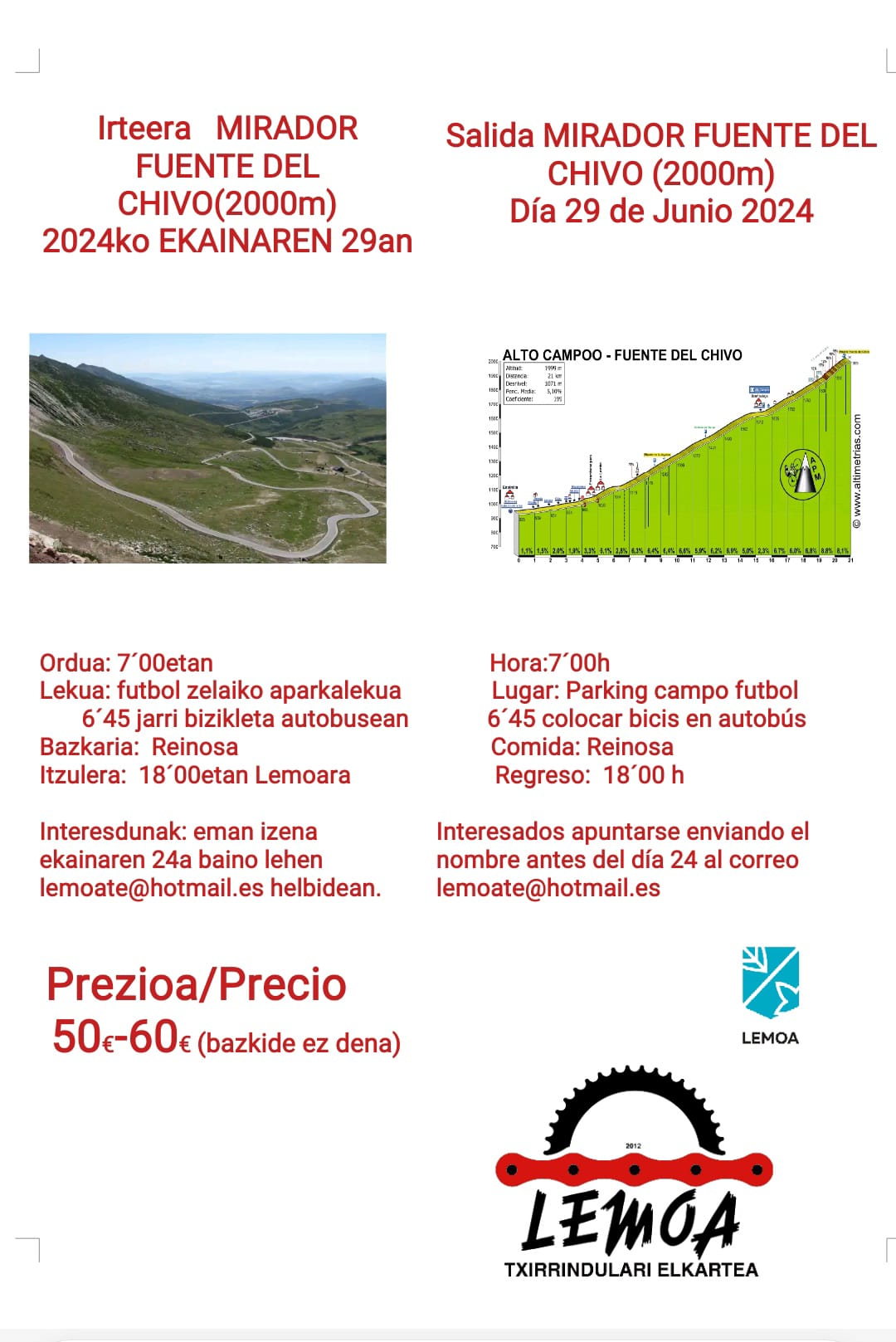 [eus] Lemoa Txirrindulari Elkarteak, Lemoako Udalaren babesarekin, irteera antolatu du Mirador Fuente del Chivora (2.000 m) ekainaren 29an. Egun osoko irteera izango da eta interesdunek ekainaren 24a baino lehen eman behar dute izena lemoate@hotmail.es helbidera idatziz.