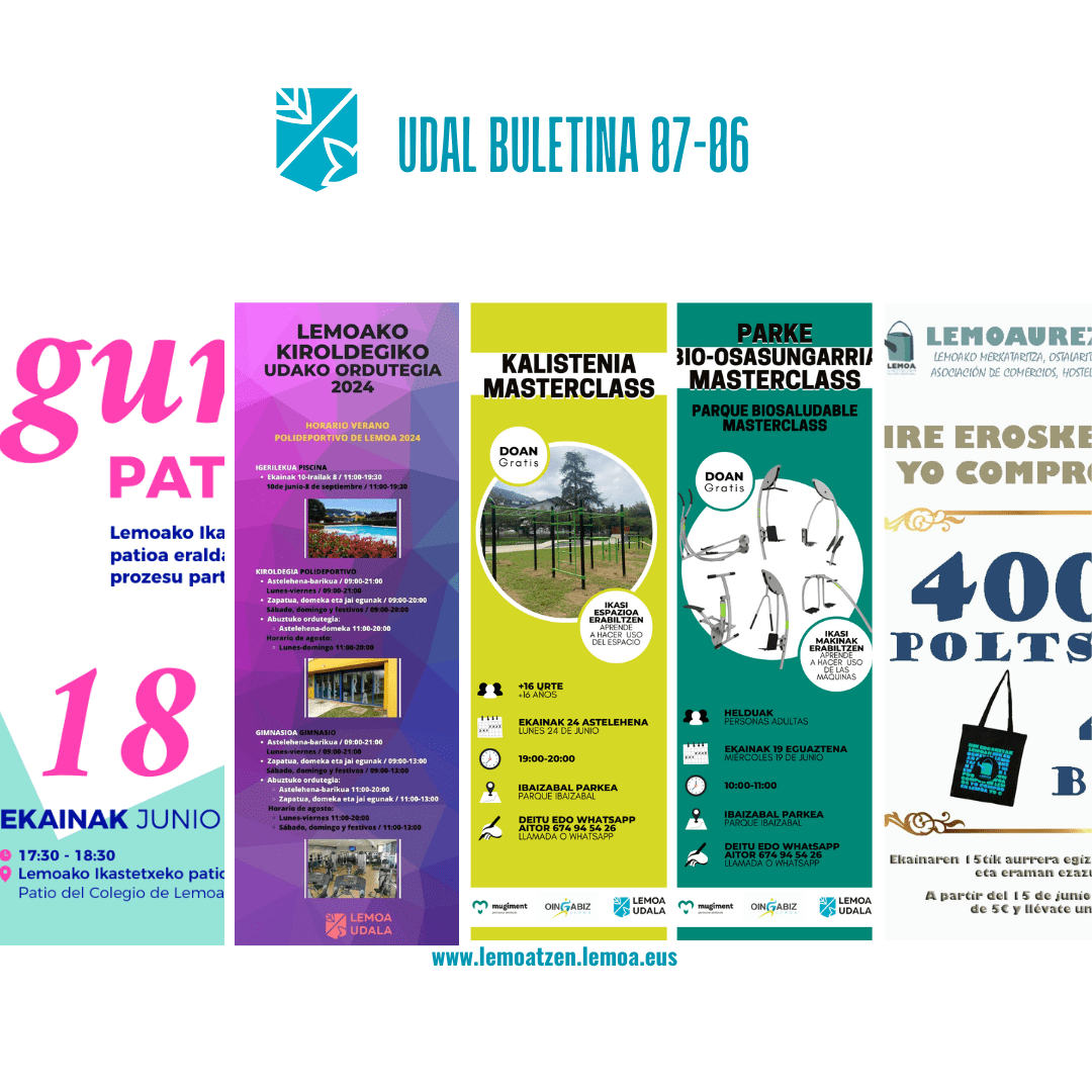 Atalak Udal buletina- Boletín digital Udal Buletina Ekainak 7 de junio Gehiago irakurri titularraren gainean klikatuz Leer más haciendo clic sobre el titular Post author Garatzailea: lemoatzen Post date 2024-06-07 Sticky post Boletín Municipal Udal-igerilekuetako taberna-kafetegia ustiatzea lizitatu du udalak – El ayuntamiento licita la explotación del bar-cafetería de las piscinas municipales de Lemoa Ekainaren 10ean irekiko da kanpoko udal-igerilekua – La piscina municipal exterior se abrirá el 10 de junio 2024ko jaietatik etxera bueltatzeko autobusa – Autobús para la vuelta a casa de las fiestas de 2024 Atzerako kontaketako eta seinale akustikodun sistema berria Tallarretako semaforoan – Nuevo sistema de cuenta regresiva y señal acústica en el semáforo de Tallarreta Margotze-lanak Lemoako aparkalekuetan – Labores de pintura en los aparcamientos de Lemoa Lemoako skill park berriak ‘Luis Zubero’ izena izango du – El nuevo skill park de Lemoa recibe el nombre de ‘Luis Zubero’ Gure patioa Euskara ikasleek dirulaguntzak jasotzeko epea zabaldu du HABEk – HABE abre el plazo para que las y los alumnos de euskera soliciten subvenciones Gazteei entzuten: galdetegia – Escuchando a la juventud: cuestionario Oinezbusa 2024-2025: izena emateko epea ekainaren 9an amaituko da – El plazo de inscripción finaliza el 9 de junio Hegaztien behatoki baten bila – Se busca lugar para observatorio de aves Eskola Jaia – Fiesta de la escuela Lemoa Txirrindulari Elkartearen irteera – Salida de Lemoa Txirrindulari Elkartea Nire erosketak Lemoan – Yo compro en Lemoa Ekainaren 9an amaituko da “Lemoan, eskatu euskaraz eta saria irabazi” merkataritza kanpaina – La campaña “»¡En Lemoa, pide en euskera y obtén un premio!» finaliza el 9 de junio Ekainean bi masterclass: kalistenia eta parke bio-osasungarria – Dos clases magistrales en mayo: calistenia y parque biosaludable Korrontzi Kotxepinen izango da gaur! – ¡Korrontzi actuará hoy en Kotxepin! “Ez esan inori” umeentzako ipuin kontaketa – Cuentacuentos infantil “Olaiaren lorategia”: galerari eta absentziei buruzko antzezlana – “El jardín de Olivia”: una obra de teatro sobre la pérdida y las ausencias Lemoan Lan: maiatzeko balorazioa – Lemoan Lan: valoración de mayo Lemoan Lan: asteroko lanpostu eskaintzak – Ofertas semanales de empleo Comparte: Share on X (Opens in new window) X Share on Facebook (Opens in new window) Facebook Atsegin dut Kargatzen... ← Lemoan Lan: asteroko lanpostu eskaintzak – Ofertas semanales de empleo → Lemoan Lan: asteroko lanpostu eskaintzak – Ofertas semanales de empleo