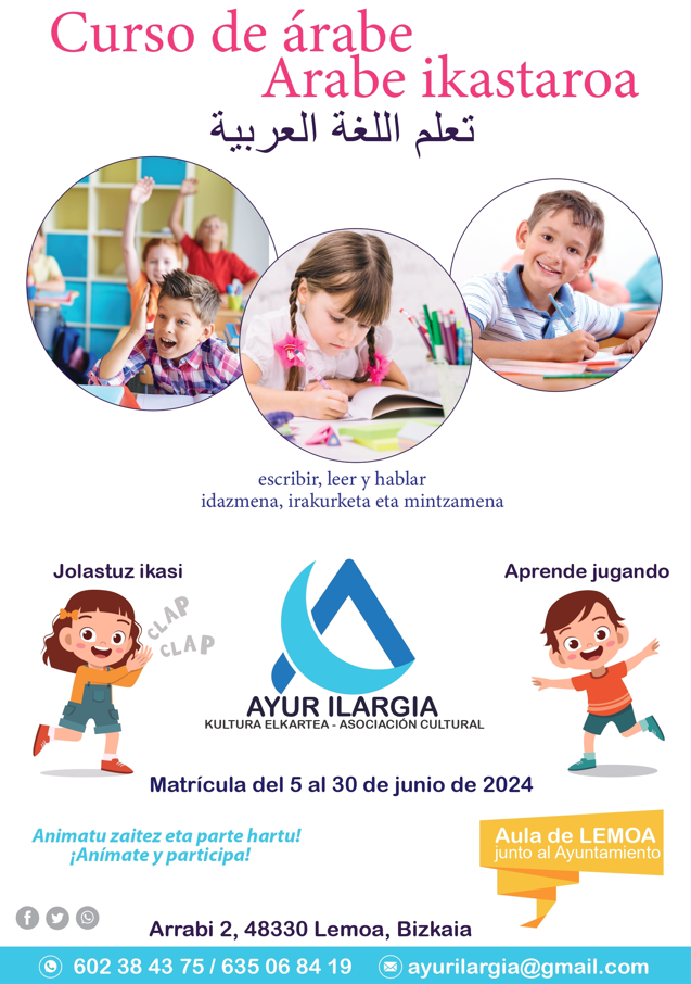 [eus] Ayur Ilargia kultura elkarteak arabe ikastaroa eskainiko du Lemoan. Ikasleek idazmena, irakurmena eta mintzamena landuko dituzte. Matrikula egiteko epea irekita dago jada, eta ekainaren 30era arte egongo da zabalik. Animatu zaitez eta parte hartu!