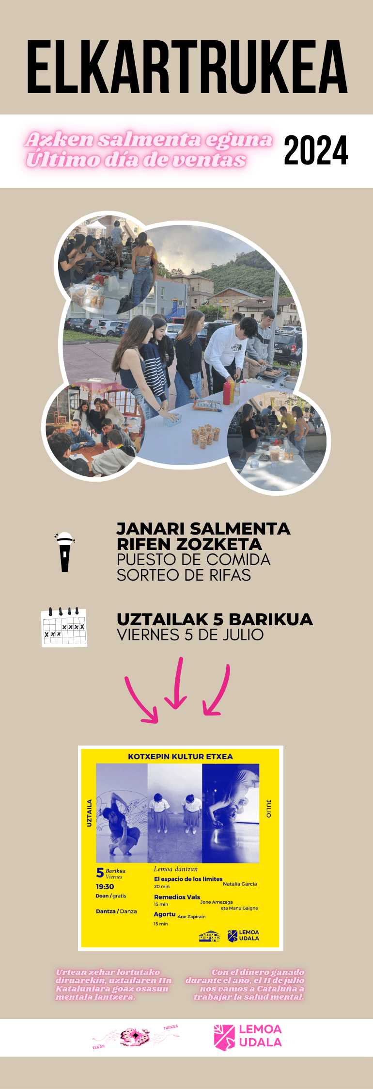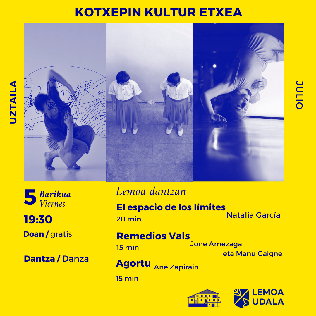 [cas] Esta tarde, a partir de las 19:30 horas, habrá tres actuaciones de danza en Kotxepin: “El espacio de los límites”, de Natalia García; “Remedios Vals”, de Jone Amezaga y Manu Gaigne; y “Agortu”, de Ane Zapirain. Además, para ayudar a amenizar la tarde, los y las jóvenes de Elkartruke realizarán su última venta; así, además de vender comida, realizarán un sorteo de rifas. Con el dinero obtenido a lo largo del año, el 11 de julio viajarán a Cataluña para tratar el tema de la salud mental.