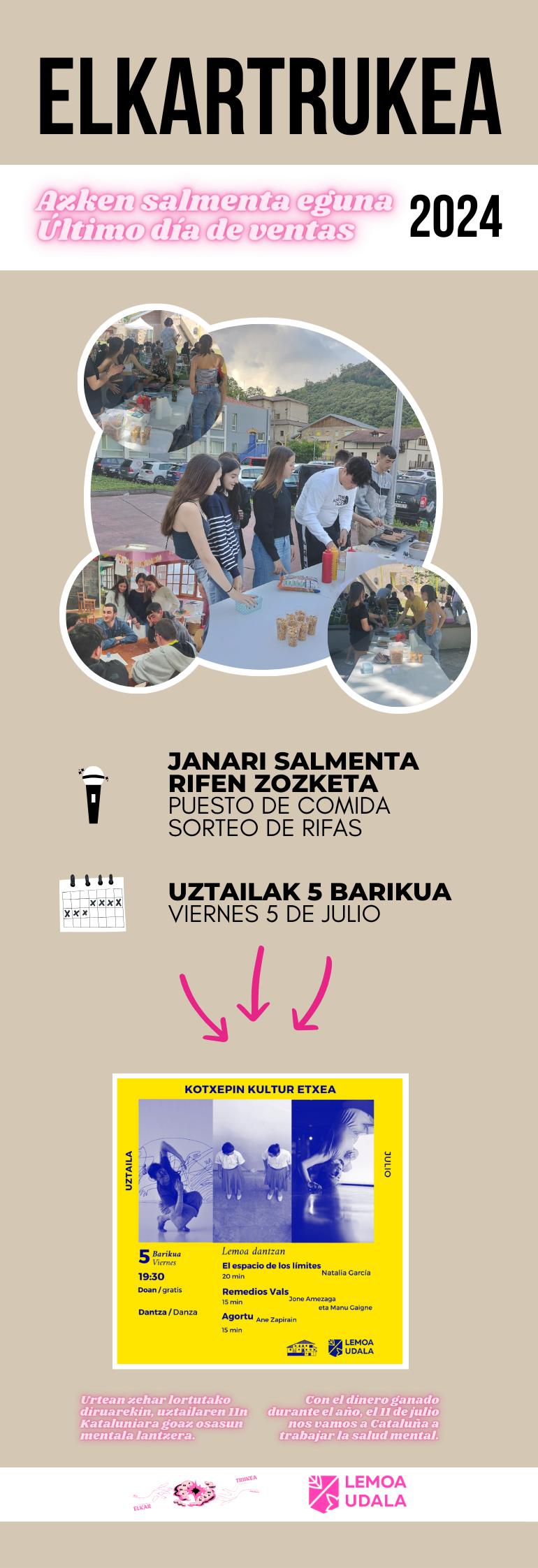 [eus] Gaur arratsaldean, 19:30etik aurrera, hiru dantza emanaldi izango dira Kotxepinen: “El espacio de los límites” (Natalia García), “Remedios Vals” (Jone Amezaga eta Manu Gaigne) eta “Agortu” (Ane Zapirain). Horrez gain, arratsaldea girotzen laguntzeko, Elkartrukeko gazteek azken salmenta egingo dute; hala, janaria saltzeaz gain, rifen zozketa egingo dute. Urtean zehar lortutako diruarekin, uztailaren 11n Kataluniara … Irakurtzen jarraitu Ekimenez betetako arratsaldea gaur Kotxepinen – Tarde repleta de iniciativas hoy en Kotxepin