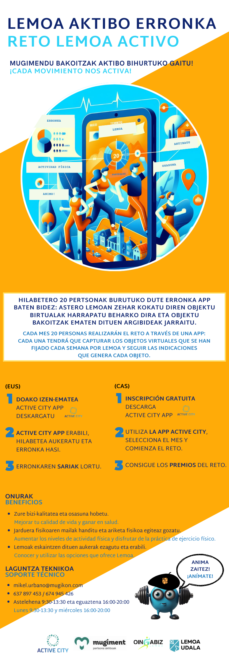 [eus] Aurtengo erronkaren irizpidea argia da: hilabete bakoitzean 20 pertsonak burutuko dute erronka app baten bidez. Eta zertan datza erronka? Astero Lemoan zehar zehaztu diren objektu birtualak harrapatu beharko dira eta objektu bakoitzak ematen dituen argibideak jarraitu. Izen-ematea doakoa da. Hona hemen parte hartzeko jarraitu beharreko pausoak: 1. Active City App deskargatu. 2. Active City … Irakurtzen jarraitu Gogoratu martxan dela Lemoa aktibo erronka! – ¡Recuerda que el reto Lemoa activo está en marcha!