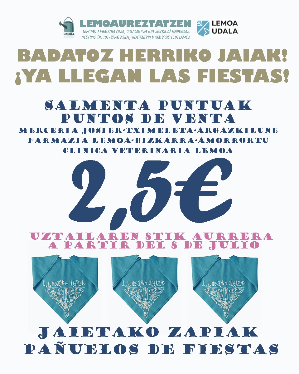 [eus] Badatoz herriko jaiak, eta salgai dira jada jaietako zapiak honako komertzio hauetan: Merceria Josier, Tximeleta, Argazkilune, Farmazia Lemoa, Bizkarra, Amorrortu eta Clínica Veterinaria Lemoa. Egon adi eta erosi zurea!