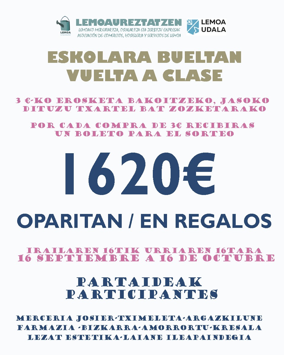 [cas] Con el fin de impulsar el comercio del municipio, la asociación Lemoa Ureztatzen ha puesto en marcha una nueva campaña con la colaboración del Ayuntamiento. Así, por cada compra superior a 3 euros realizada entre el 16 de septiembre y el 16 de octubre entraréis en el sorteo de una gran variedad de regalos: menús, material escolar, tartas, láser… ¡y mucho más!