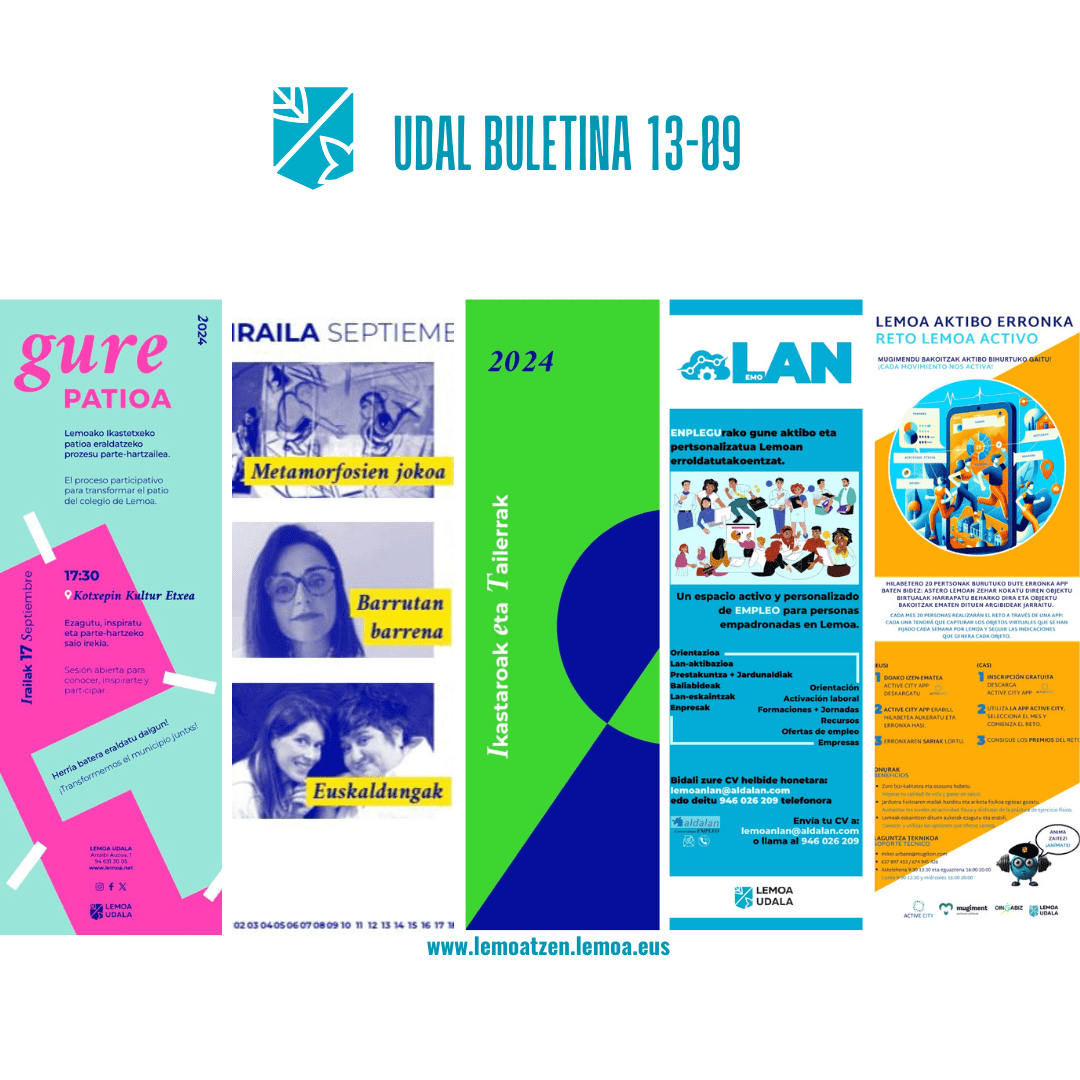 Atalak Udal buletina- Boletín digital Udal Buletina Irailak 13 de septiembre Gehiago irakurri titularraren gainean klikatuz Leer más haciendo clic sobre el titular Post author Garatzailea: lemoatzen Post date 2024-09-13 Boletín Municipal Udan ere etengabe aritu da lanean udala – Incluso en verano el ayuntamiento ha trabajado sin descanso Udalak eskuhartzea indartuko du segurtasunaren arloan – El Ayuntamiento reforzará la intervención en materia de seguridad Aurrekontuak: herritarren partaidetza – Presupuestos: participación ciudadana Gure patioa Udal ikastaroak eta tailerrak 2024-2025 – Cursos y talleres municipales 2024-2025 Bueltan da ludoteka! – ¡La ludoteca está de vuelta! bideON ARRATIAN garraio-zerbitzu jasangarria bueltan da ikasturte berrian ere – bideON ARRATIAN retoma la plena actividad con el inicio del nuevo curso Enplegagarritasunean laguntzen Lemoan Lan bitartez – Acompañando a la empleabilidad con Lemoan Lan Oingabiz: jarduera fisikoko orientazio zerbitzua – Servicio de orientación de actividad física Gogoratu martxan dela Lemoa aktibo erronka! – ¡Recuerda que el reto Lemoa activo está en marcha! Zapatuan Ausarten Kopa Lemoan! – ¡El sábado Ausarten Kopa en Lemoa! 1620 euro oparitan eskolara buelta dela eta– 1620 euros en regalos por la vuelta a clase Kotxepin Kultur Etxea: hiruhileko programazioa – Programación trimestral Irailaren 21ean Lemoako Eskupilota Taldearen urteurrena! – ¡El 21 de septiembre Lemoako Eskupilota Taldea celebrar su aniversario! Lemoan Lan: asteroko lanpostu eskaintzak – Ofertas semanales de empleo Comparte: Share on X (Opens in new window) X Share on Facebook (Opens in new window) Facebook Atsegin dut Kargatzen... ← Lemoan Lan: asteroko lanpostu eskaintzak – Ofertas semanales de empleo → Lemoan Lan: asteroko lanpostu eskaintzak – Ofertas semanales de empleo