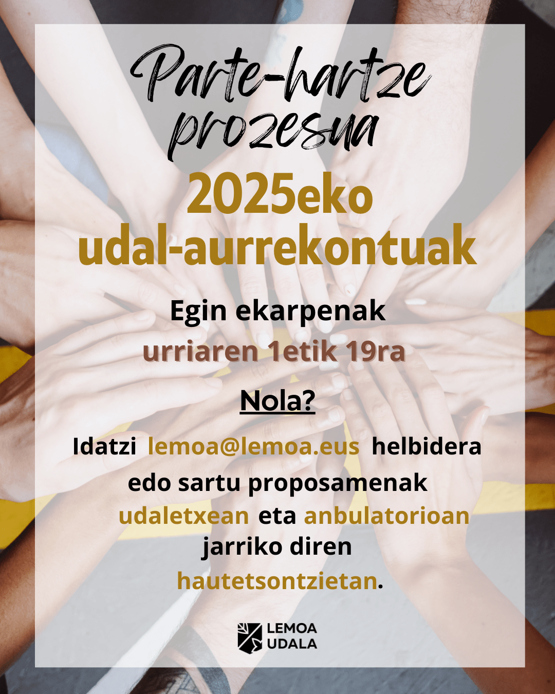[eus] Dagoeneko udala lanean dabil datorren ekitaldirako aurrekontuak diseinatzeko, eta, hori dela eta, Lemoako bizilagunei ekarpenak egiteko deia egiten die.