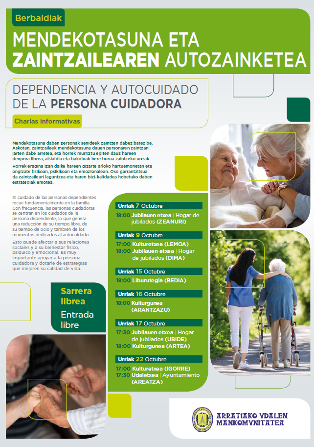[eus] Arratiako Udalen Mankomunitateak mendekotasuna eta zaintzailearen autozainketari buruzko hitzaldi-zikloa antolatu du Mankomunitatea osatzen duten udalerrietan. Lemoan urriaren 9an izango da, arrastiko 17:00etan, Kotxepin kultur etxean. Erdu eta ikas dezagun elkarrekin zaintzailea jagoten! [cas] Arratiako Udalen Mankomunitatea ha organizado un ciclo de charlas informativas sobre dependencia y autocuidado de la persona cuidadora en los municipios … Irakurtzen jarraitu Berbaldia: mendekotasuna eta zaintzailearen autozainketa – Charla informativa: dependencia y autocuidado de la persona cuidadora