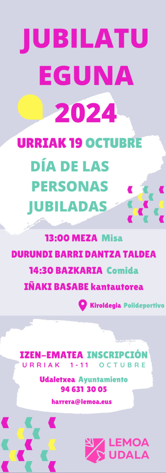 [Esp] El 19 de octubre se celebrará el Día de las Personas Jubiladas en Lemoa. Será un día completo con misa, danzas, comida y la actuación del cantautor Iñaki Basabe.