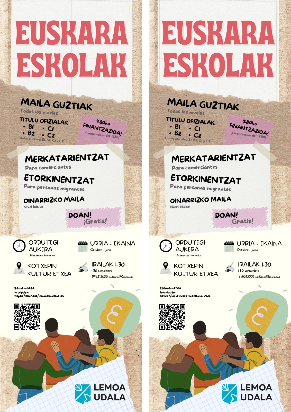 [cas] Todos los años, del 1 al 30 de septiembre está abierto el plazo de inscripción para las clases de euskera de Lemoa. Por lo tanto, la inscripción está abierta hasta el próximo lunes. El curso está financiado al 80% por el Ayuntamiento de Lemoa. Plazas limitadas. ¡Date prisa y apúntate!