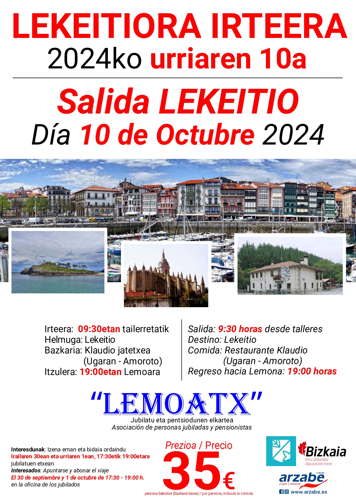 [eus] Lemoatx Jubilatu eta Pentsiodunen Elkarteak Lekeitio bisitatzeko bidaia antolatu du urriaren 10ean. Izen-ematea irailaren 30ean eta urriaren 1ean egin ahal izango da jubilatuen etxean, 17:30etik 19:00etara. [cas] La Asociación de Personas Jubiladas y Pensionistas Lemoatx ha organizado una excursión para visitar Lekeitio el 10 de octubre. La inscripción podrá realizarse los días 30 de … Irakurtzen jarraitu Lemoatx elkartearen irteera Lekeitiora – Excursión de la asociación Lemoatx a Lekeitio