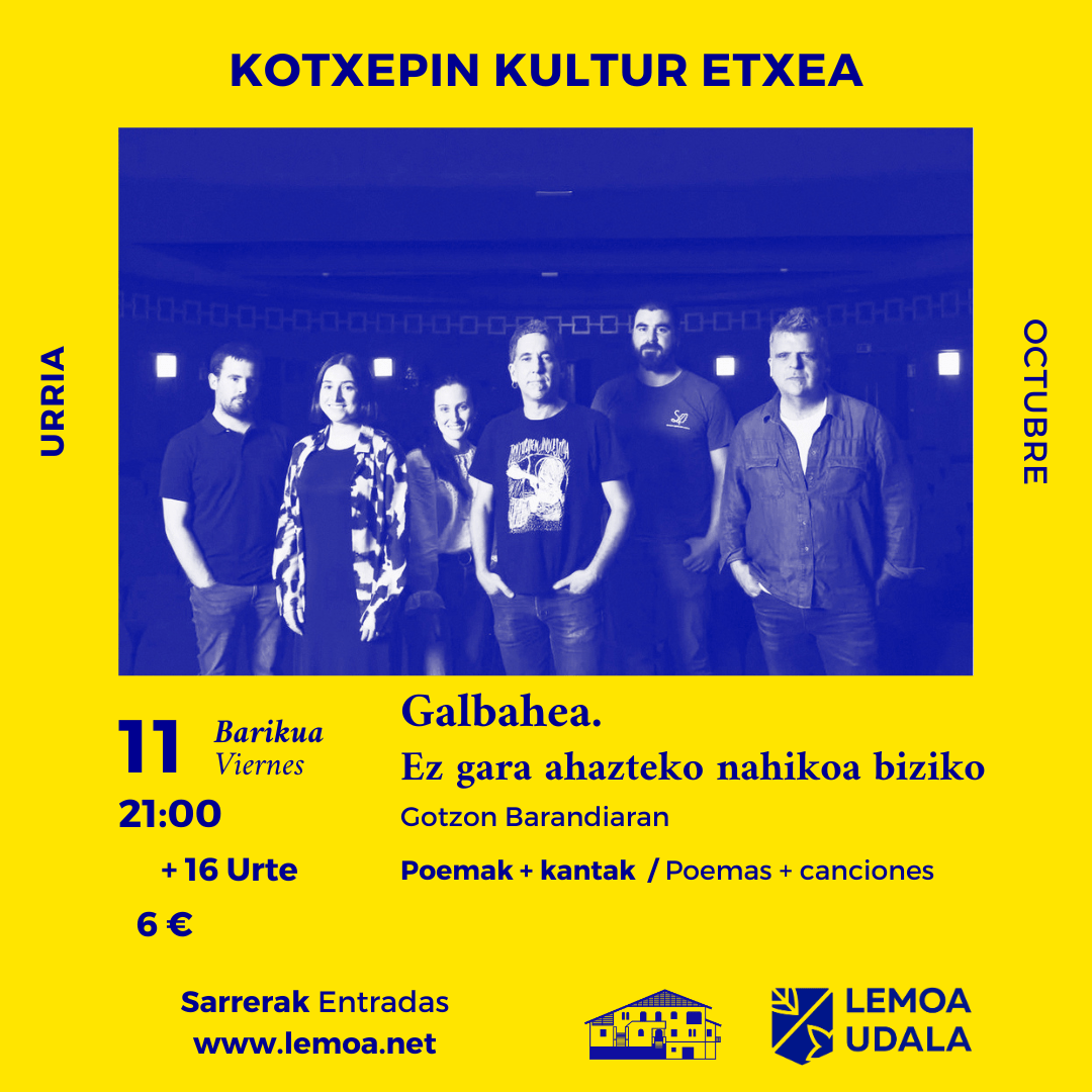 [eus] Urriaren 11n, musika eta poesia izango dira protagonista Kotxepinen; izan ere, gaueko 21:00etan, Gotzon Barandiaranek bere “Galbahea: Ez gara dena ahazteko nahikoa biziko” poema-liburuaren egokitzapen eszenikoa eskainiko du.