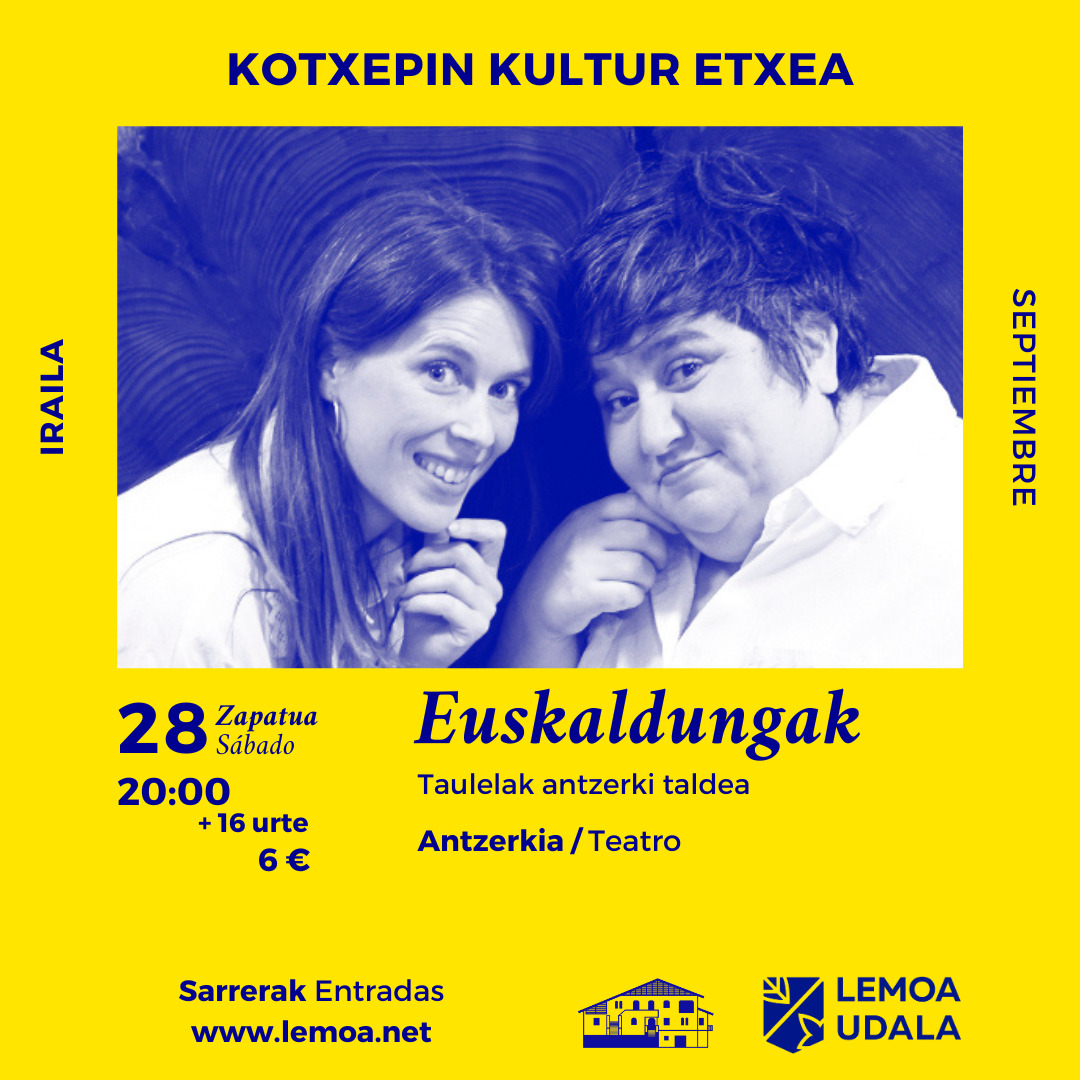 [eus] Euskaldungo. Iz. Euskaldunaren ezaugarria, euskalduntasuna. Zer esango dute euskaldun berri batek eta euskaldun zahar batek euskarari buruz? Euskararekin duten erlazioaz? Bere istorioaz? Istoria? Historia? H-rekin edo gabe? A itsatsia dauka? Sarrerak: https://kultura.lemoa.net/sarrerak [cas] Aroa Blanco y Maite Lopez suben juntas a un escenario para contar las aventuras que han vivido con el fascinante mundo … Irakurtzen jarraitu Zapatuan “Euskaldungak” antzerki-saioa Kotxepinen! – ¡El sábado la función de teatro “Euskaldungak” en Kotxepin!