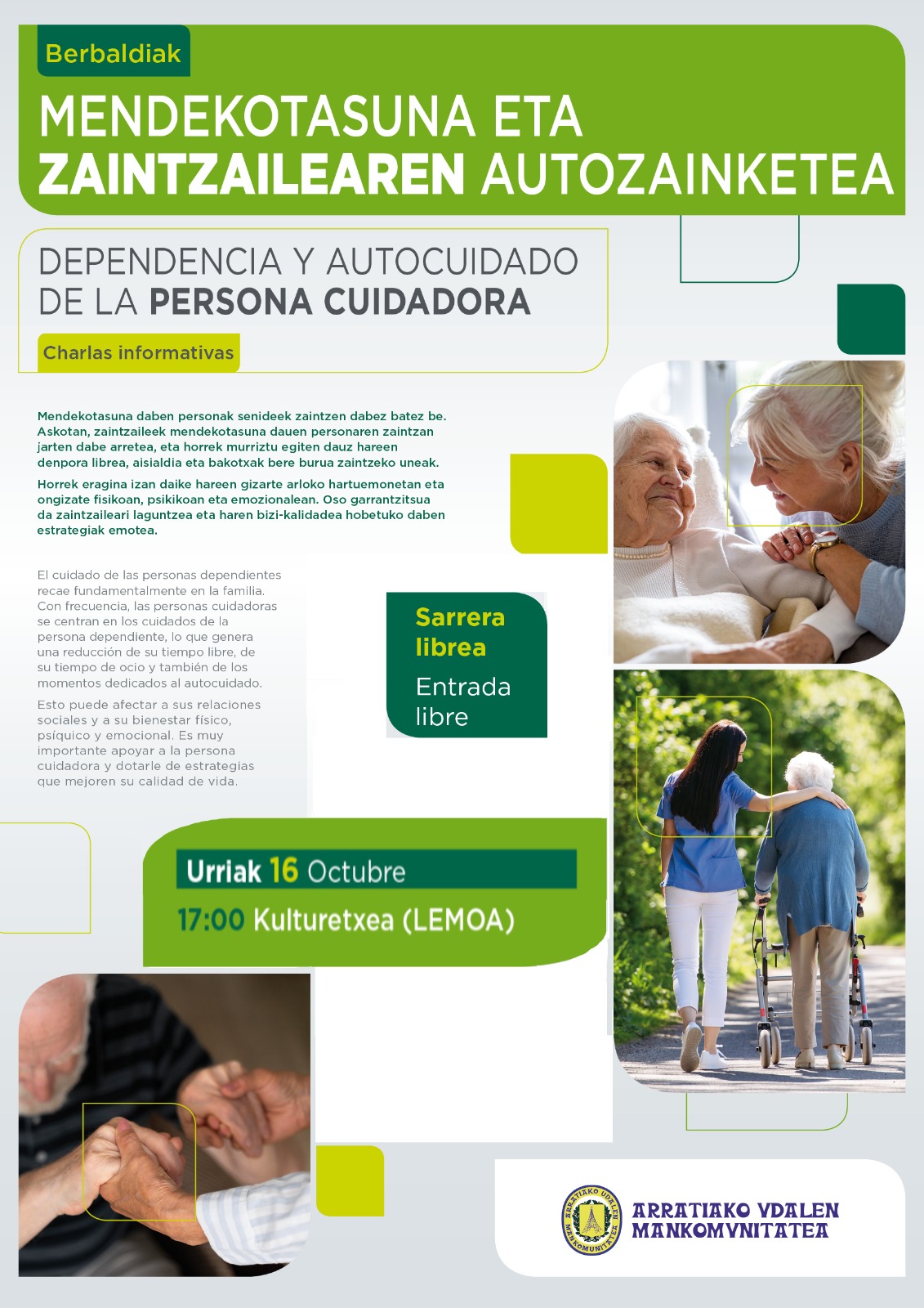 [cas] Arratiako Udalen Mankomunitatea ha organizado un ciclo de charlas informativas sobre dependencia y autocuidado de la persona cuidadora en los municipios componen la Mancomunidad. En Lemoa, la charla tendrá lugar el 16 de octubre a las 17:00 en la casa de cultura Kotxepin. ¡Acércate y aprendamos a cuidar de la persona cuidadora!