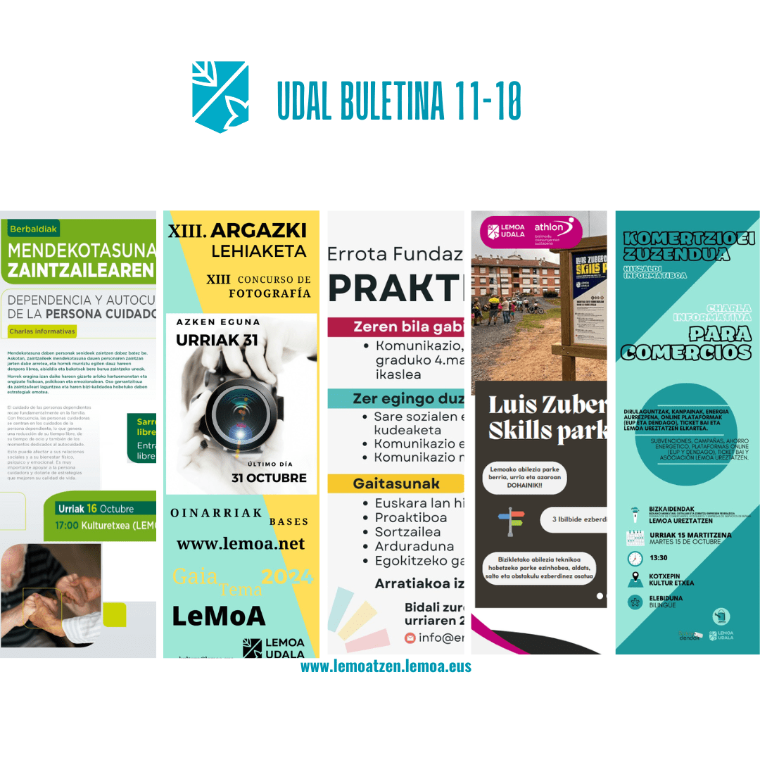 Atalak Udal buletina- Boletín digital Udal Buletina Urriak 11 de octubre Gehiago irakurri titularraren gainean klikatuz Leer más haciendo clic sobre el titular Post author Garatzailea: lemoatzen Post date 2024-10-11 Boletín Municipal Udalak barandak jarri ditu Intzuntza auzoko eskaileretan – El ayuntamiento instala barandillas en las escaleras del barrio Intzuntza Umeen Kontseilua: Zergatik dauzkazu bi ordenagailu? – Consejo de la Infancia: ¿Por qué tienes dos ordenadores? Elkartrukeko gazteek prest dute urte amaierako lana – Las y los jóvenes de Elkartruke ya tienen listo el trabajo de fin de año Luis Zubero skill park berria martxan da jada! – ¡El nuevo skill park Luis Zubero ya está en marcha! Azaroaren 29an, Arratiako 2. Enplegu Azoka! – ¡El 29 de noviembre, la 2ª Feria de Empleo de Arratia! Gogoratu zabalik dela argazkigintza digitalari buruzko ikastaroan izena emateko epea! – ¡Recordad que sigue abierto el plazo de inscripción para el curso de fotografía digital! Lemoako Zero Zabor Hozkailu Solidarioak martxan jarraitzen du– La Nevera Solidaria Residuo Cero de Lemoa sigue en marcha Lemoako XIII. Argazki lehiaketak martxan jarraitzen du – El XIII Concurso de fotografía de Lemoa sigue en marcha Komertzioei zuzendutako hitzaldi informatiboa – Charla informativa para comercios Berbaldia: mendekotasuna eta zaintzailearen autozainketa – Charla informativa: dependencia y autocuidado de la persona cuidadora Ikuskizunez betetako hilabetea Kotxepinen! – ¡Mes repleto de espectáculos en Kotxepin Lemoan Lan: asteroko lanpostu eskaintzak – Ofertas semanales de empleo Comparte: Share on X (Opens in new window) X Share on Facebook (Opens in new window) Facebook Atsegin dut Kargatzen... ← Lemoan Lan: asteroko lanpostu eskaintzak – Ofertas semanales de empleo → Lemoan Lan: asteroko lanpostu eskaintzak – Ofertas semanales de empleo