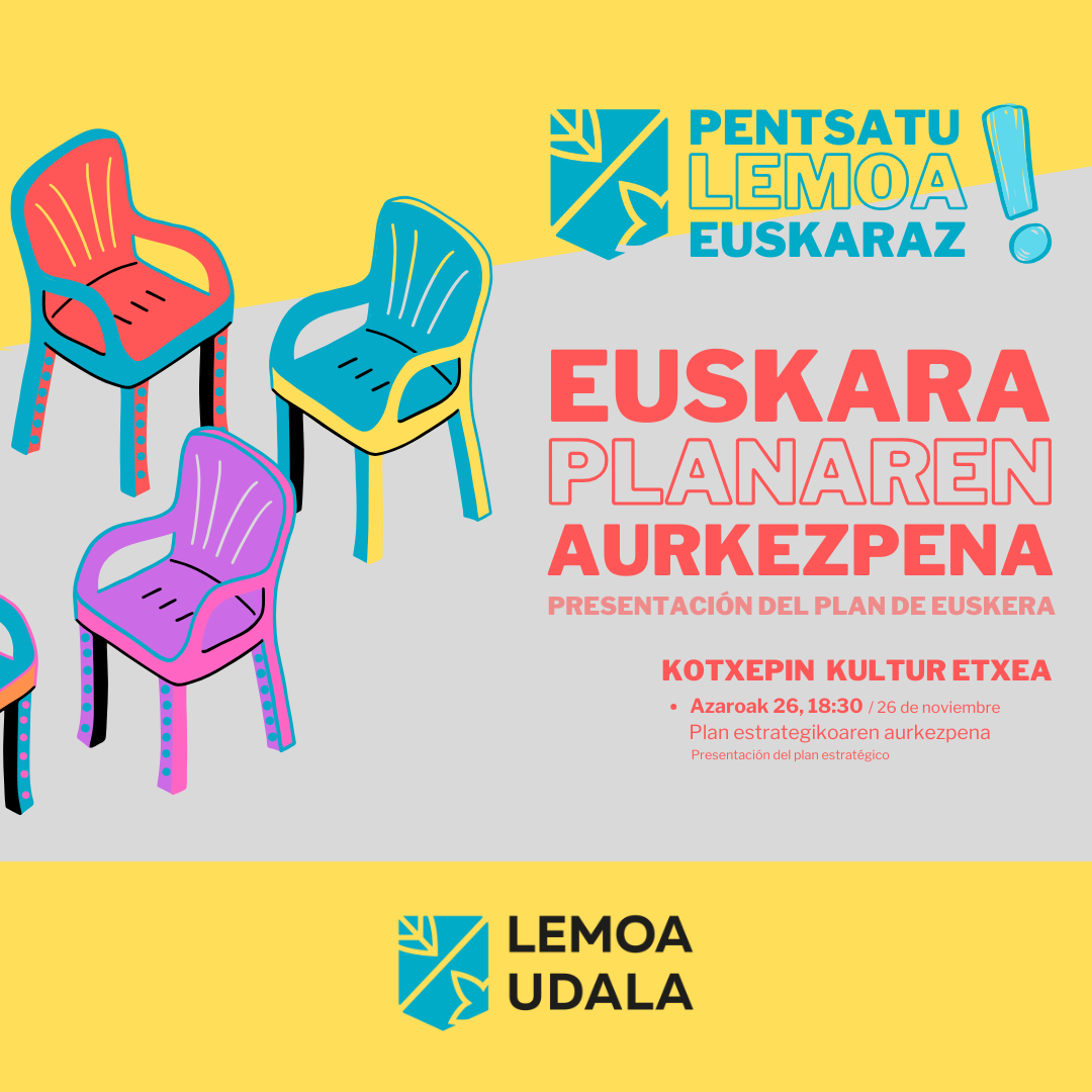 [eus] Euskara Plan berria egiteko Lemoako Udalak parte-hartze prozesua bat jarri zuen abian. Prozesu horretatik lortutako emaitza da 2025-2029 Lemoako Euskara Plana, eta datorren martitzenean, azaroak 26, arrastiko 18:30ean aurkeztuko da Kotxepinen. Bertan, prozesuaren nondik norakoa azalduko da, plana bera aurkeztu, eta bertaratzen diren herritarrek ekarpenak egiteko aukera izango dute. [cas] Para la elaboración del … Irakurtzen jarraitu Azaroaren 26an, 2025-2029 Lemoako Euskara Planaren aurkezpena egingo da – El 26 de noviembre se presenta el Plan de Euskera de Lemoa 2025-2029