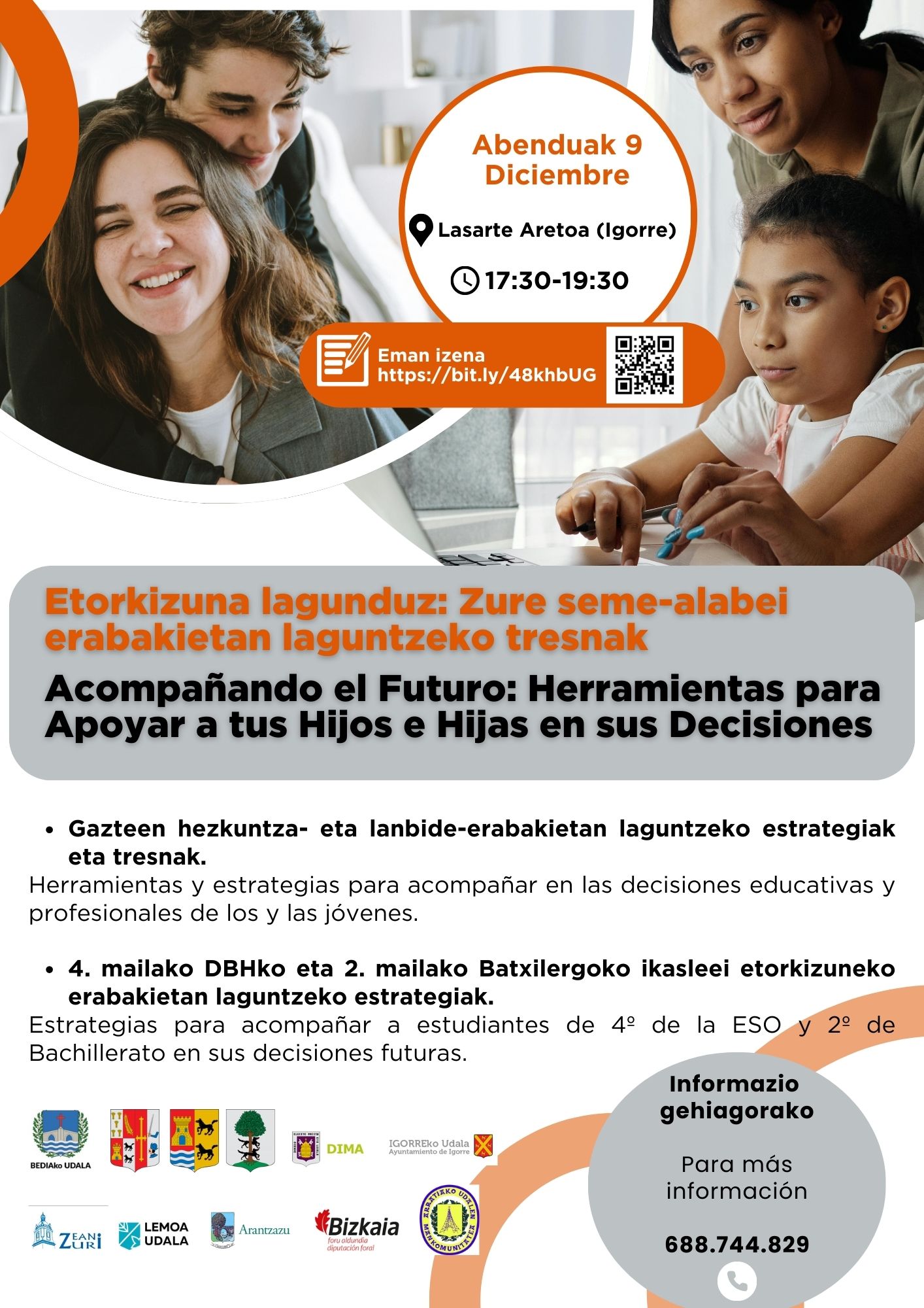 [eus] Gaztedi Arratia 2024 programaren barruan, gurasoei zuzendutako orientazio-jardunaldia antolatu dute. Bertan, gazteen hezkuntza- eta lanbide-erabakietan laguntzeko estrategiak eta tresna eskainiko dituzte, baita 4. mailako DBHko eta 2. Batxilergoko ikasleei etorkizuneko erabakietan laguntzeko estrategiak ere. Jardunaldia astelehenean, abenduaren 9an, izango da Igorreko Lasarte aretoan, 17:30etik 19:30era. Informazio gehiago nahi izatekotan, deitu 688744829 telefono-zenbakira. Izen-ematea honako … Irakurtzen jarraitu Etorkizuna lagunduz: zure seme-alabei erabakietan laguntzeko tresnak – Acompañando el futuro: herramientas para apoyar a tus hijos e hijas en sus decisiones