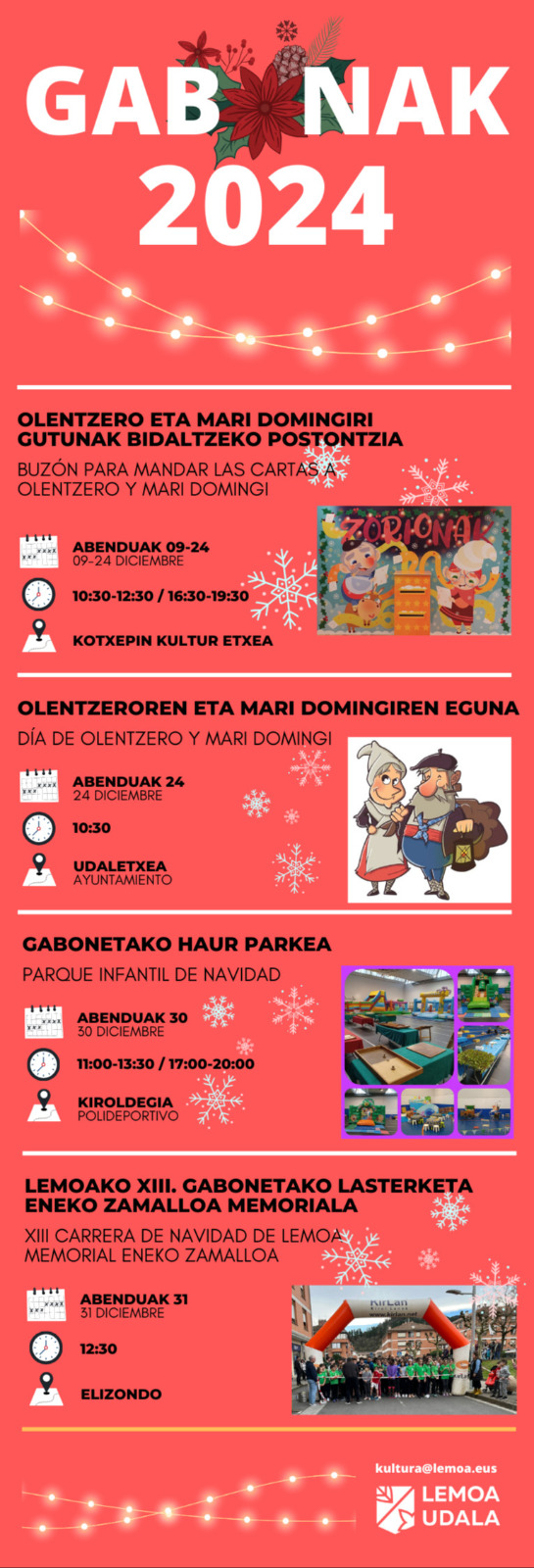 [eus] Gabonetarako egitarau oparoa prestatu du Udalak. Olentzero eta Mari Domingiri gutunak uzteko postontzia, gutun horien lehiaketa, Olentzero eta Mari Domingiren eguna, Gabonetako haur parkea eta Eneko Zamalloa memoriala izango ditugu, besteak beste. Modu berean, Ludotekak eta Gaztelekuek ere bere programazioa prestatu dute. Gabonetan zehar herrian dabiltzanak ez dira aspertuko! [cas] El Ayuntamiento de Lemoa … Irakurtzen jarraitu Gabonak 2024