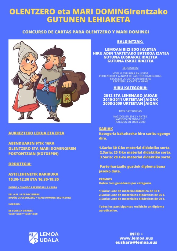[eus] Olentzero eta Mari Domingi oso lanpetuta ibiliko dira datozen asteetan, eta opariak etxe guztietara heldu daitezen antolakuntza on bat behar-beharrezkoa da. Horregatik, Lemoako umeen kasuan Kotxepin kultur etxean utzi beharko dituzte gutunak, abenduaren 9tik 24ra, 10:30etik 12:30era, eta 16:30etik 19:30era.