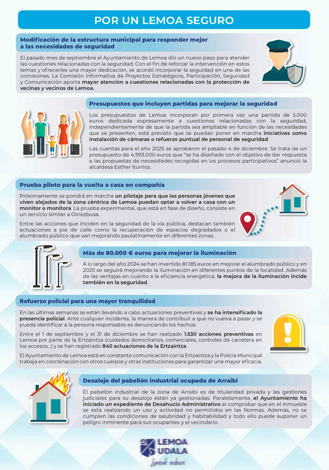[eus] Udalak lanean jarraitzen du Lemoa seguruagoaren alde, eta hainbat neurri hartu ditu, hala nola udal-egitura aldatzea segurtasun-beharrei hobeto erantzuteko, aurrekontuetan segurtasuna hobetzeko partidak sartzea, etxera lagunduta itzultzeko proba pilotua, polizia-errefortzua, etab.