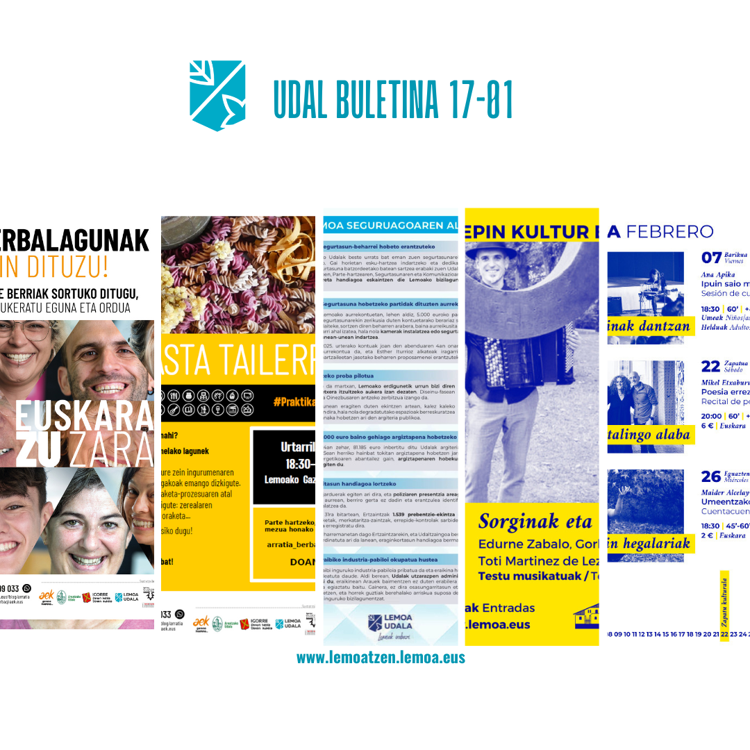 Atalak Udal buletina- Boletín digital Udal Buletina Urtarrilak 17 de enero Gehiago irakurri titularraren gainean klikatuz Leer más haciendo clic sobre el titular Post author Garatzailea: lemoatzen Post date 2025-01-17 Boletín Municipal Udalak AROA Euskararen Plan Estrategiko berria eta atari digitalean egoitza elektronikoa .eus izatera igarotzea onartu ditu osoko bilkuran – El Ayuntamiento aprueba el nuevo el Plan Estratégico de Euskera AROA y el traspaso al dominio .eus de la sede electrónica Udalak bideak garbitzeko zerbitzua lizitatuko du – El Ayuntamiento licita el servicio de limpieza viaria Udala labain ez egiteko tratamendua gauzatzen dabil Arraibitik Larrabeitira doan oinezkoen bidean – El Ayuntamiento está llevando a cabo un tratamiento antideslizante en el camino peatonal que une Arraibi y Larrabeiti Lemoa seguruagoaren alde – Por un Lemoa seguro Umeen aisialdia mahai gainera – El ocio infantil sobre la mesa bideON ARRATIAN garraio-zerbitzuak 6.239 bidaiarekin eta erabiltzaileen kalifikazio bikainarekin itxi du 2024. urtea – El servicio de transporte bideON ARRATIAN cierra el año 2024 con 6.239 viajes y una calificación de excelente por parte de las personas usuarias Euskara praktikatu gura duzu? Lemoan aukera duzu! Pasta egiten ikasi gura duzu? – ¿Quieres aprender a hacer pasta? Olentzero eta Mari Domingirentzako 2024ko gutun lehiaketa – Concurso de cartas a Olentzero y Mari Domingi 2024 Kotxepin Kultur Etxea: hiruhileko programazioa – Programación trimestral Toti Martinez de Lezea, Edurne Zabalo eta Gorka Hermosa izango dira gaur Kotxepinen! – ¡Toti Martinez de Lezea, Edurne Zabalo y Gorka Hermosa estarán hoy en Kotxepin! Lemoan Lan: asteroko lanpostu eskaintzak – Ofertas semanales de empleo Comparte: Share on X (Opens in new window) X Share on Facebook (Opens in new window) Facebook Atsegin dut Kargatzen... ← Lemoan Lan: asteroko lanpostu eskaintzak – Ofertas semanales de empleo → Lemoan Lan: asteroko lanpostu eskaintzak – Ofertas semanales de empleo