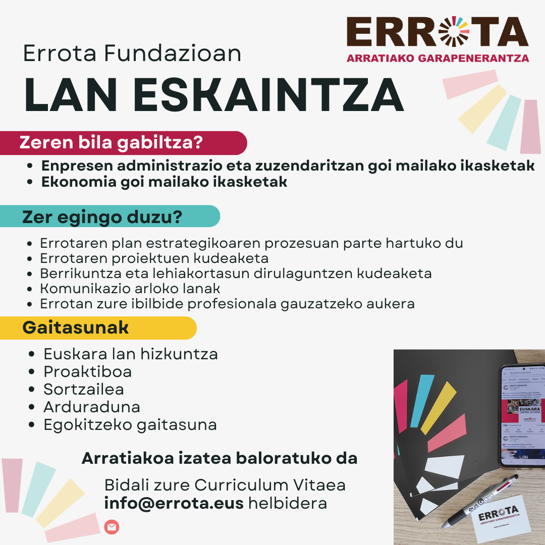 [eus] Enpresen administrazio eta zuzendaritzan edo ekonomian goi-mailako ikasketak egin dituzu? Errota Fundazioan lan egin nahi duzu? Bidali zure CVa info@errota.eus helbidera.