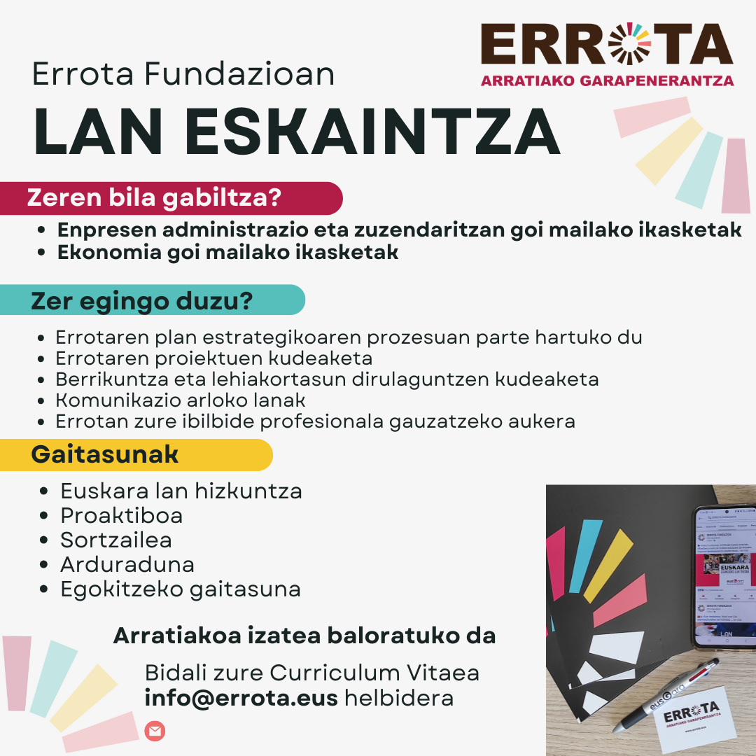 [eus] Enpresen administrazio eta zuzendaritzan edo ekonomian goi-mailako ikasketak egin dituzu? Errota Fundazioan lan egin nahi duzu? Bidali zure CVa info@errota.eus helbidera. [cas] ¿Tienes estudios superiores en Administración y Dirección de Empresas o en Economía? ¿Quieres trabajar en Errota Fundazioa? Envía tu CV a la dirección info@errota.eus.