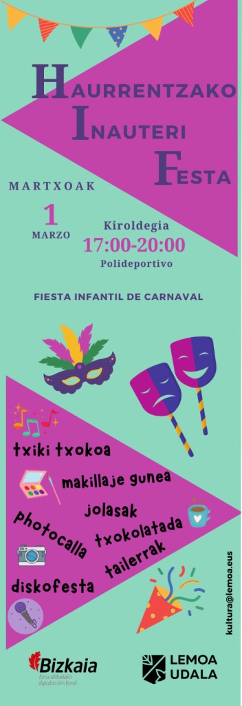 Horrez gain, urtero bezala, txikienek Haurrentzako Inauteri Festaz gozatzeko aukera izango dute. 17:00etatik 20:00etara, hamaika jarduera egin ahal izango dituzte kiroldegian: photocalla, txiki-txokoa, diskofesta eta txokolatada, besteak beste.