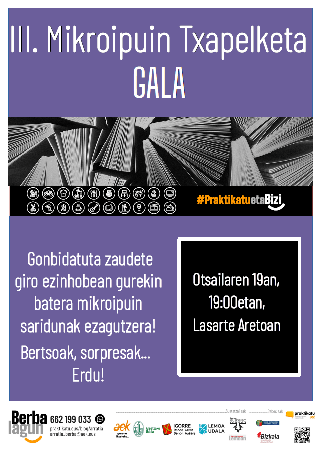 [eus] Arratiako Berbalagunek III. Mikroipuin lehiaketa antolatu zuen urte amaieran. Ipuinak bidaltzeko epea abenduaren 30ean amaitu zen, eta aurtengo edizioak izandako arrakasta ikusita, ipuin saridunak entzuteko gala berezia antolatu da Igorren! Horiez gain, bertsolariak, olerkiak, musika… egongo dira otsailaren 19an, Igorreko Lasarte Aretoan. Erdu!