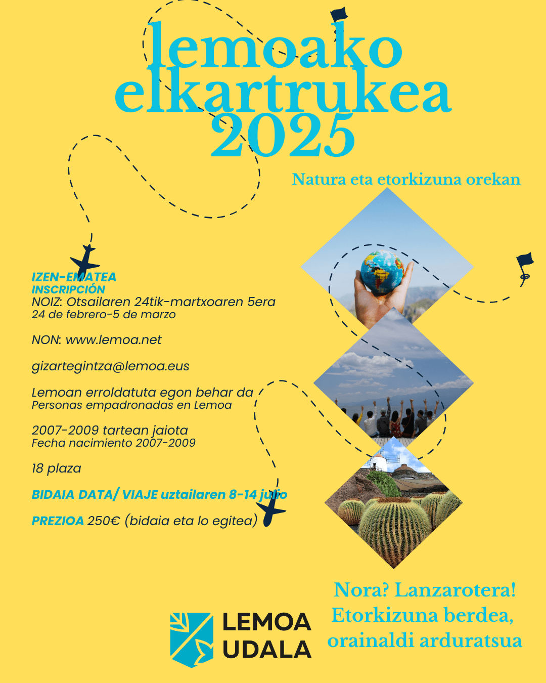 El proyecto Elkartruke combina el aprendizaje local con la experiencia internacional. Los participantes no solo realizarán el viaje a Lanzarote en julio, sino que también visitarán entidades y empresas locales para conocer diferentes perspectivas sobre la sostenibilidad. Como culminación del programa, los jóvenes trabajarán para adaptar e implementar en Lemoa las ideas y buenas prácticas observadas durante su experiencia.