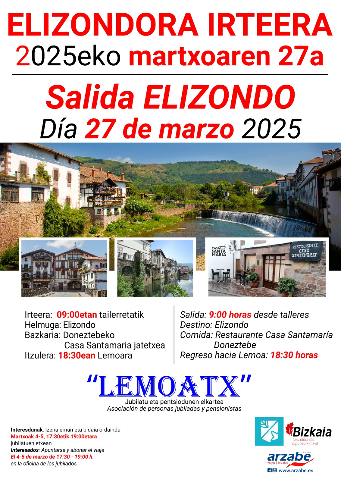 [cas] La Asociación de Personas Jubiladas y Pensionistas Lemoatx ha organizado una excursión para visitar Elizondo el 27 de marzo. La inscripción podrá realizarse los días 4 y 5 de marzo en el hogar de las personas jubiladas, de 17:30 a 19:00.