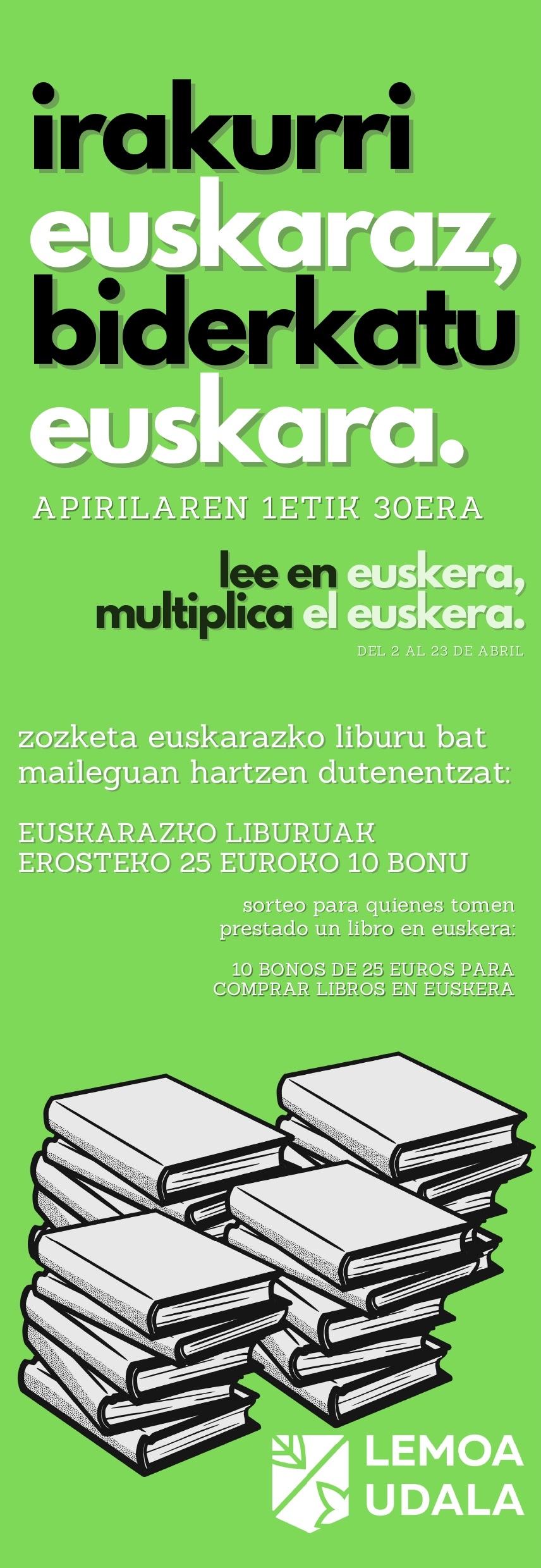[cas] Siguiendo el camino de los últimos años, el servicio de Euskera de Lemoa aprovechará el Día del Libro para animar a leer libros en euskera. Para ello han puesto en marcha un sorteo: toda aquella persona que coja un libro en euskera en la biblioteca de Lemoa entre el 1 y el 30 de abril entrará en el sorteo. ¿Qué se va a sortear? La posibilidad de seguir consumiendo euskera: Diez bonos de 25 euros para la compra de libros en euskera.