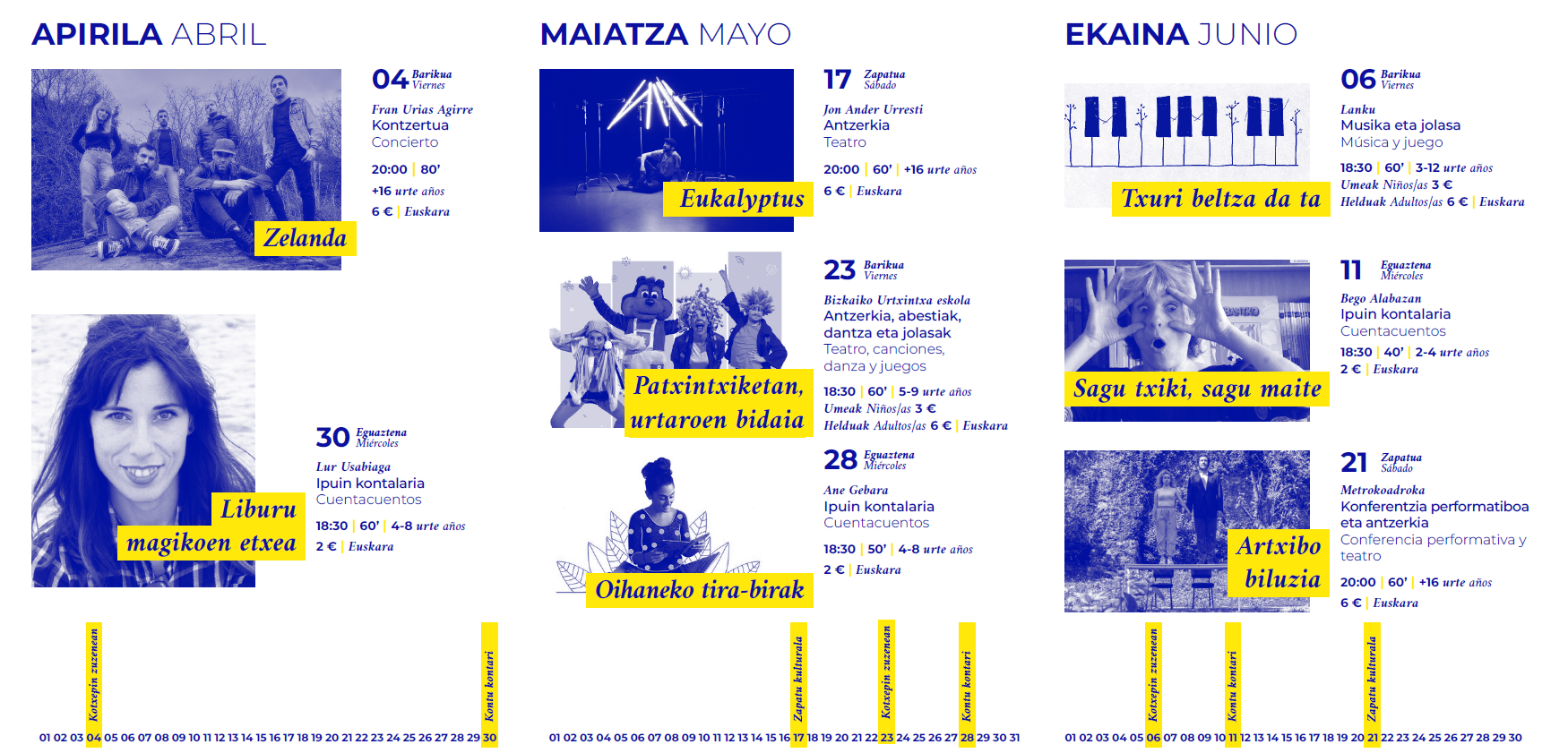 [eus] Kotxepin Kultur Etxeak hiruhileko honetarako (apirila-ekaina) programazioa iragarri du, publiko guztientzako ikuskizun eta jarduerekin: antzezlanak, ipuin kontaketak, música… Kulturaz gozatzeko aukera paregabea! Gogoratu egitasmoa laguntzeko eta deskontuez gozatzeko bazkide egiteko aukera duzula: https://labur.eus/40qUH Kultura oparia da! [cas] Kotxepin Kultur Etxea ha anunciado su programación trimestral (abril-junio), con funciones y actividades para todos los públicos: … Irakurtzen jarraitu Kotxepin Kultur Etxeko programazio berria: apirila-ekaina – Nueva programación de Kotxepin: abril-junio