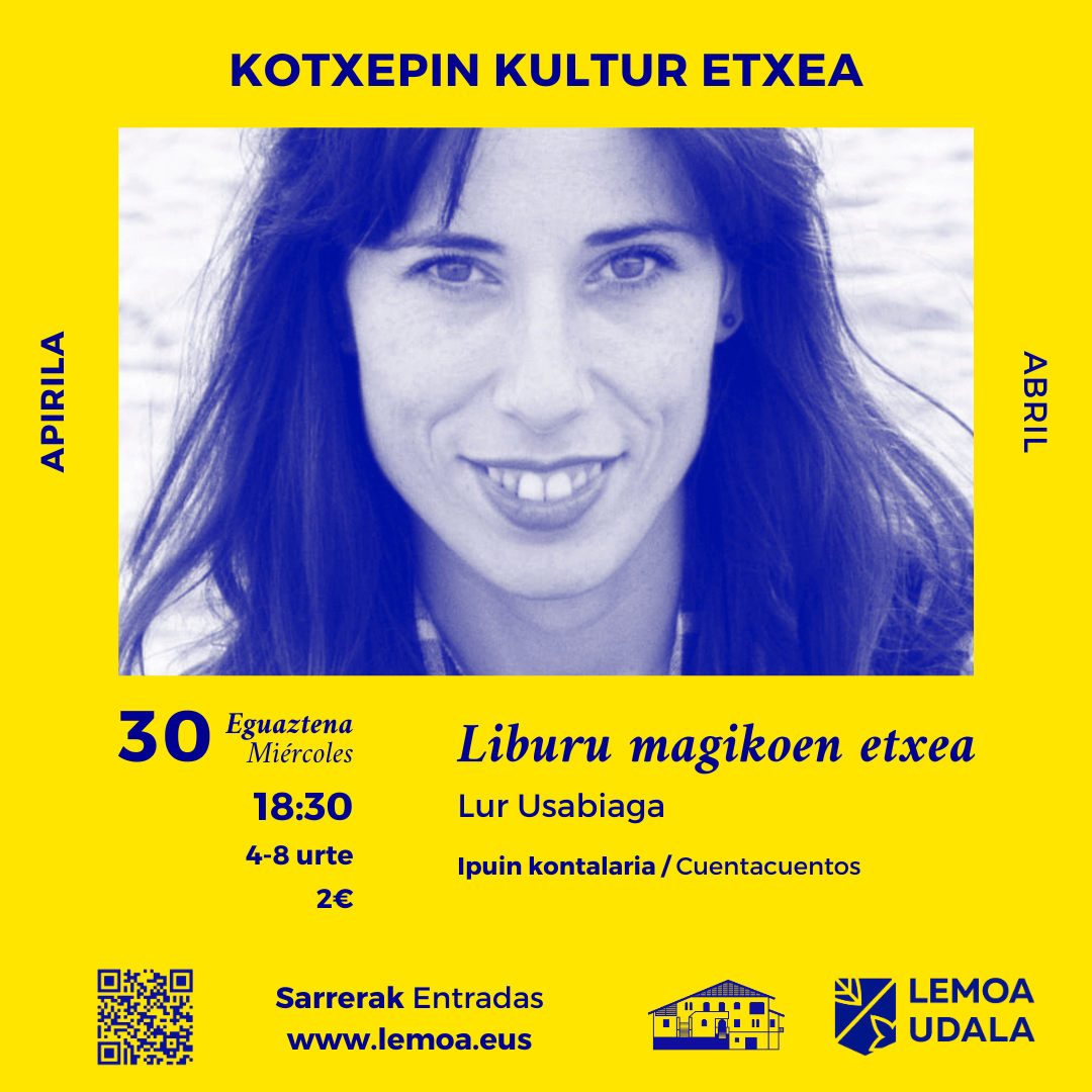 [eus] Apirilaren 30ean Lur Usabiagak 4 eta 8 urte bitarteko haurrei zuzendutako «Liburu magikoen etxea» ipuin kontaketa saioa eskainiko du Kotxepin kultur etxean.