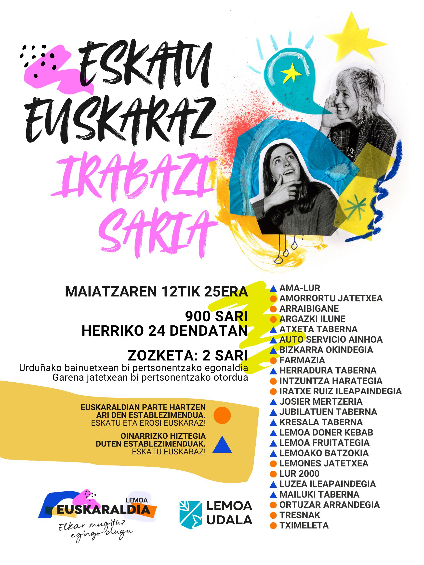 [eus] ‘Eskatu euskaraz, irabazi saria’ izeneko merkataritza kanpaina jarri du martxan Lemoako Udaleko Euskara Zerbitzuak beste urte batez. Maiatzaren 12tik 25era egingo da kanpaina, eta Euskaraldiarekin bat eginez, herritarrei eskaera egin zaie erosketak euskaraz egin ditzaten. Trukean sariren bat izan dezakeen txartel bat jasoko dute lemoaztarrek hazka egin dezaten, eta horietan 24 establezimenduk jarritako 978 … Irakurtzen jarraitu Euskaraz eskatzen duten herritarrentzat 978 sari banatuko dira Lemoako 24 denda eta tabernetan – Se entregarán 978 premios en 24 comercios y bares de Lemoa para la ciudadanía que pida en euskera