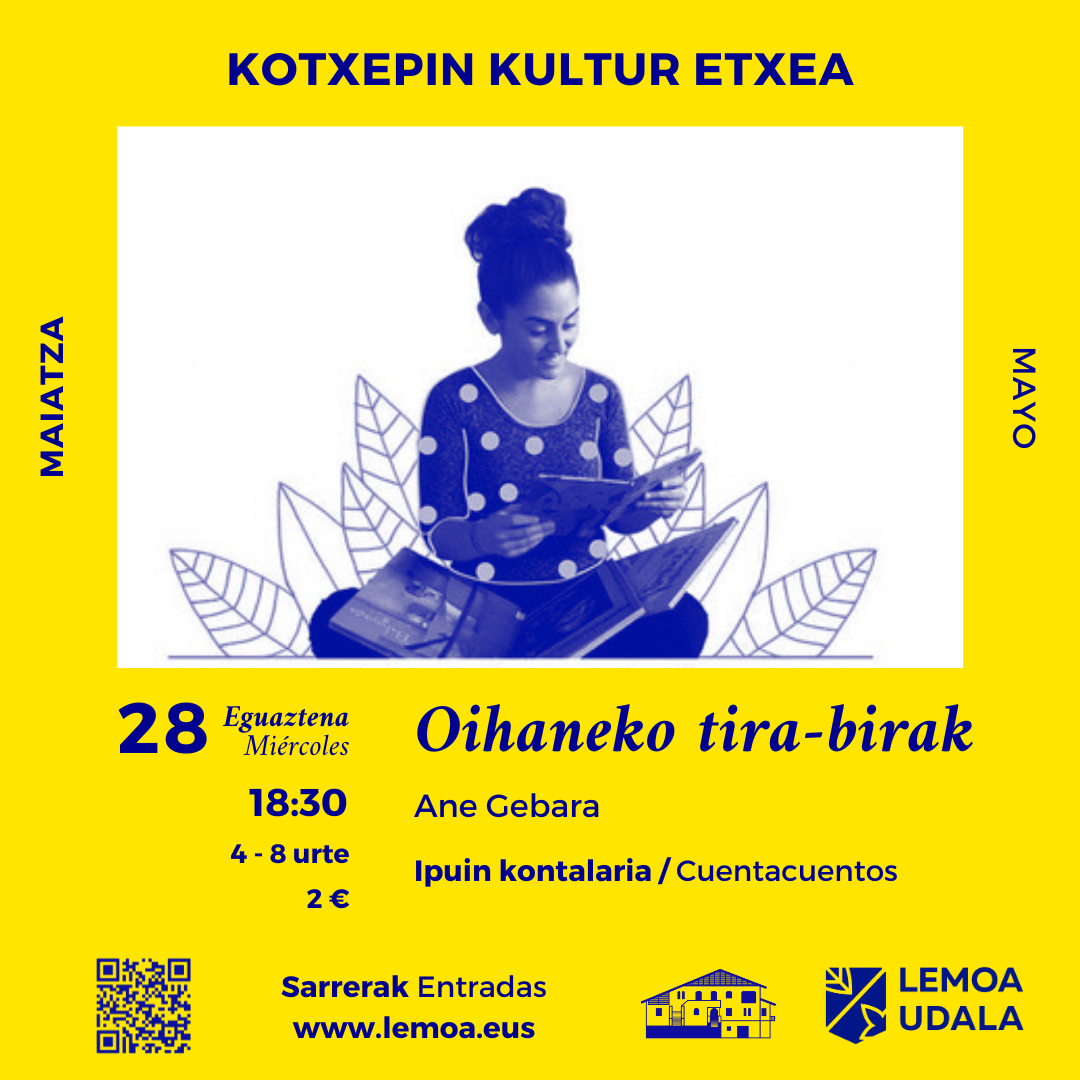 [eus] Maiatzaren 28an Ane Gebara ipuin kontalariak «Oihaneko tira-birak» ikuskizuna eskainiko die 4 eta 8 urte bitarteko haurrei Kotxepinen. Saioa 18:30ean izango da. Animatu zaitezte! Sarrerak: https://kultura.lemoa.net/sarrerak [cas] El 28 de mayo la cuentacuentos Ane Gebara ofrecerá la función «Oihaneko tira-birak» para niñas y niños de entre 4 y 8 años en Kotxepin. Será a … Irakurtzen jarraitu Maiatzaren 28an ipuin kontalaria Kotxepinen! – ¡El 28 de mayo cuentacuentos en Kotxepin!
