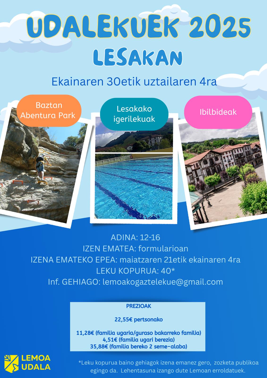 [eus] Lemoako Udalak udalekuak antolatu ditu Lesakan ekainaren 30etik uztailaren 4ra, 12 eta 16 urte bitarteko gazteentzat. Parte-hartzaileek hainbat jardueraz gozatzeko aukera izango dute: Baztan Abentura Park-a bisitatu, Lesakako igerilekuetara joan, hainbat ibilbide egin…