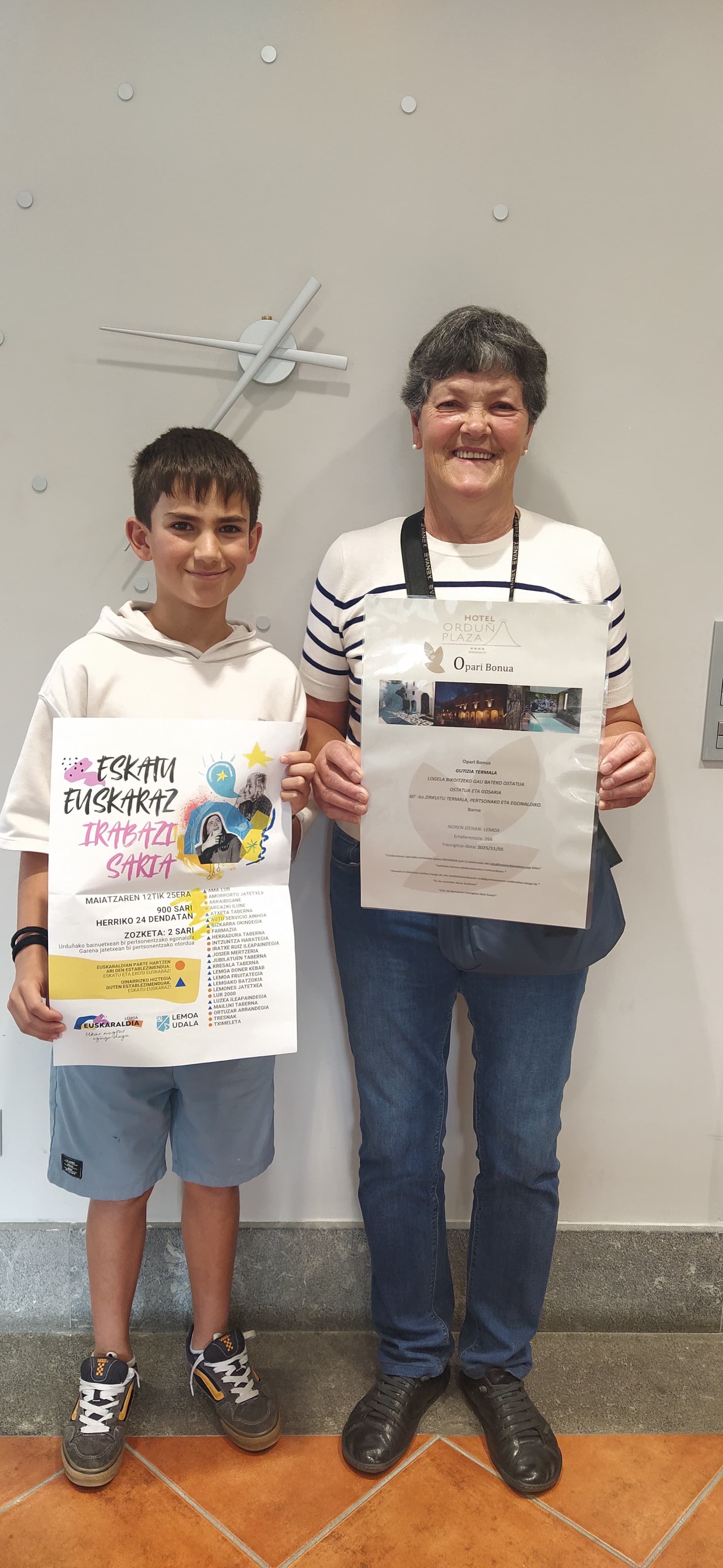 [cas] El pasado 12 de mayo se puso en marcha la campaña “Eskatu Euskaraz, irabazi saria” con el objetivo de impulsar el uso del euskera y las ventas en los diferentes territorios locales. La campaña ha coincidido tanto en fechas como en objetivos con Euskaraldia y, aprovechando este hecho, la intención ha sido escuchar más euskera en las calles de Lemoa. Quienes hayan pedido o comprado en euskera en los comercios durante estos días han recibido un boleto con el que han podido canjear 914 premios en el mismo lugar de la compra. A ellos se han sumado otros dos grandes premios: una estancia para dos personas en el balneario de Orduña, y un menú para dos personas en el restaurante Garena.